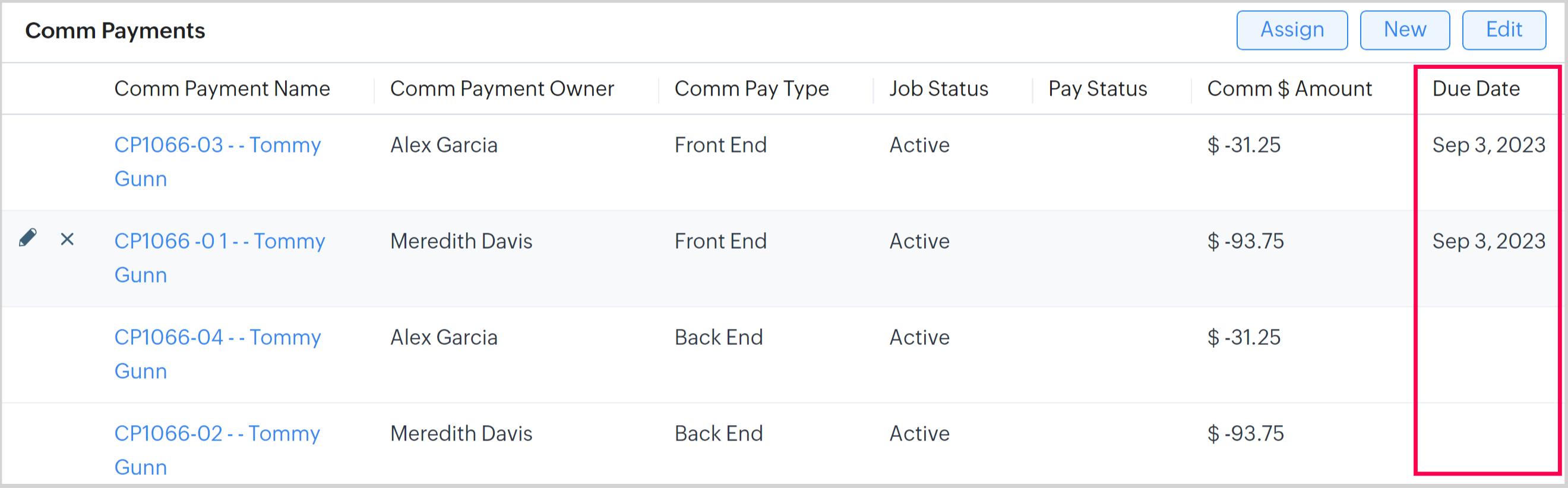 8. After refreshing the commission record, you will notice that the relevant commission payments have been created for that specific commission. For Front End Comm Payment records, the Due Date will correspond to the date when the sale or change order was signed. On the other hand, Back End Comm Payment records will initially have no due date. This field will automatically be populated with the date when the related sale record is paid in full.