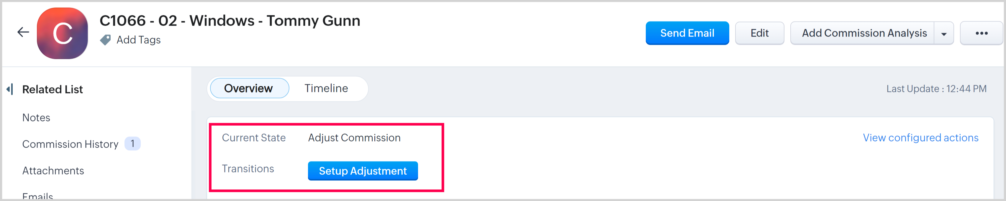 2. A new window will open up with the new commission record. Note, the new commission record has a current state of "Adjust Commission". Click the Setup Adjustment transition.