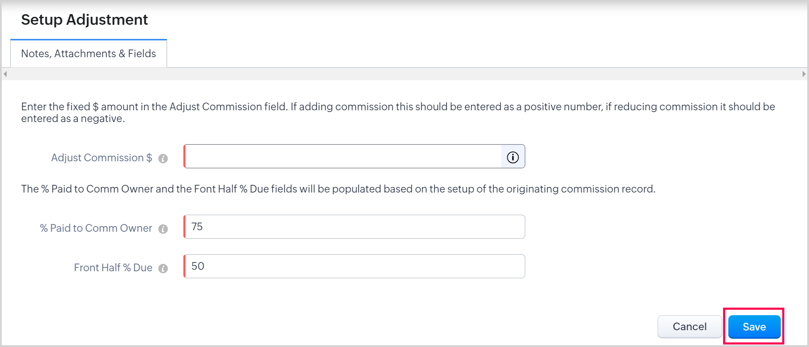 Adjustment Commission $ - To add a fixed dollar amount of commission, such as a bonus, you would enter a positive number in this field. This positive number indicates the additional commission that should be added. On the other hand, if you need to subtract a fixed dollar amount of commission, you would enter a negative number in this field. This negative number represents the amount of commission that should be deducted.