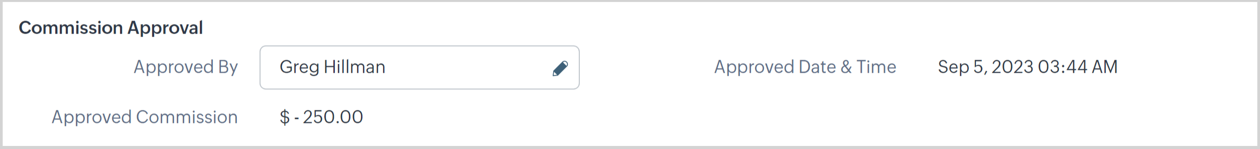7. Once the commission adjustment is approved, the Commission Approval fields will be automatically populated with the following information: the username of the person who approved the commission, the date and time of the approval, and the approved commission amount.