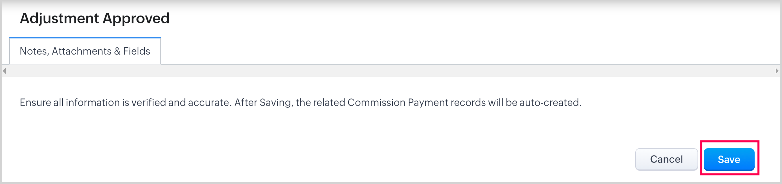 6. The Adjustment Approved message box will appear ensuring you have verified all is accurate and advising that the related commission payments will be auto-created upon saving. Click the Save button.