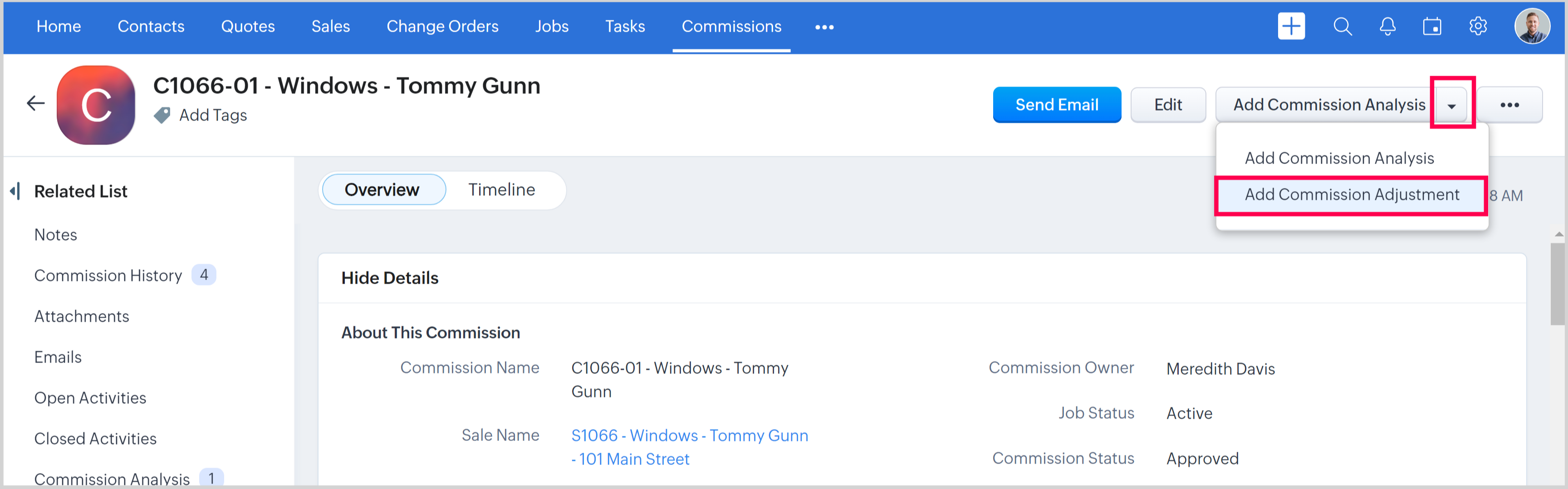 1. On the originally approved commission record, select the Add Commission Adjustment button in the top right hand corner.
