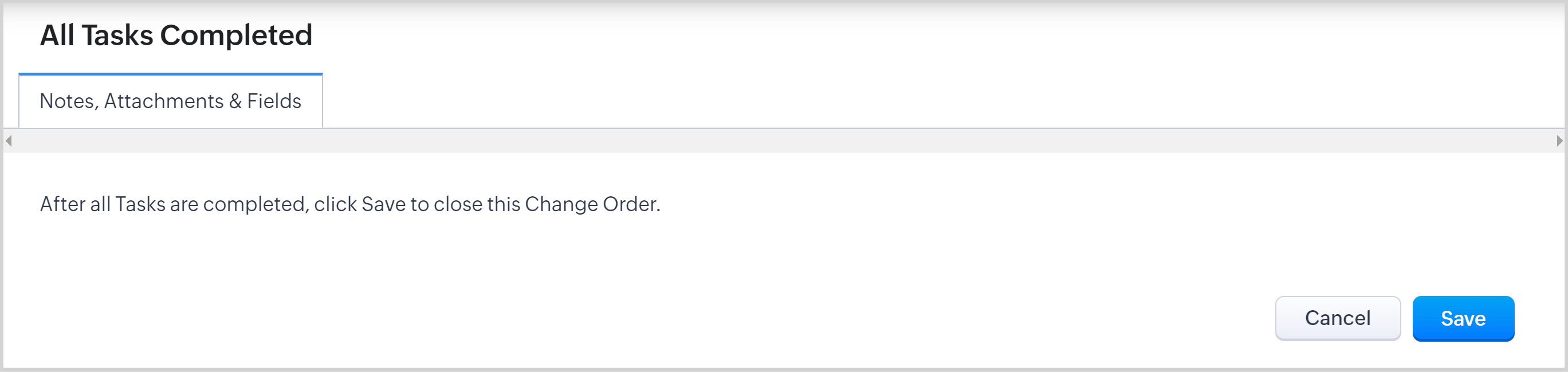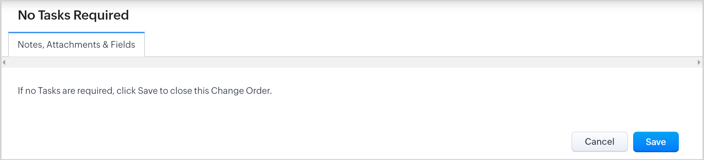 2. A message box will open confirming no tasks are required, click Save. Upon Saving, the record will move to the Change Order Closed State.