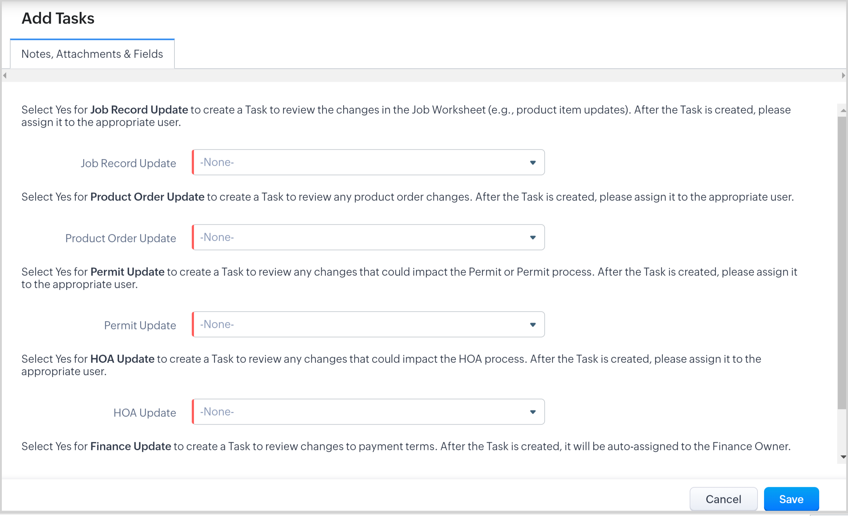 - Job Record Update - Yes/No Picklist, if Yes is selected a Job Record Update task will be created.
