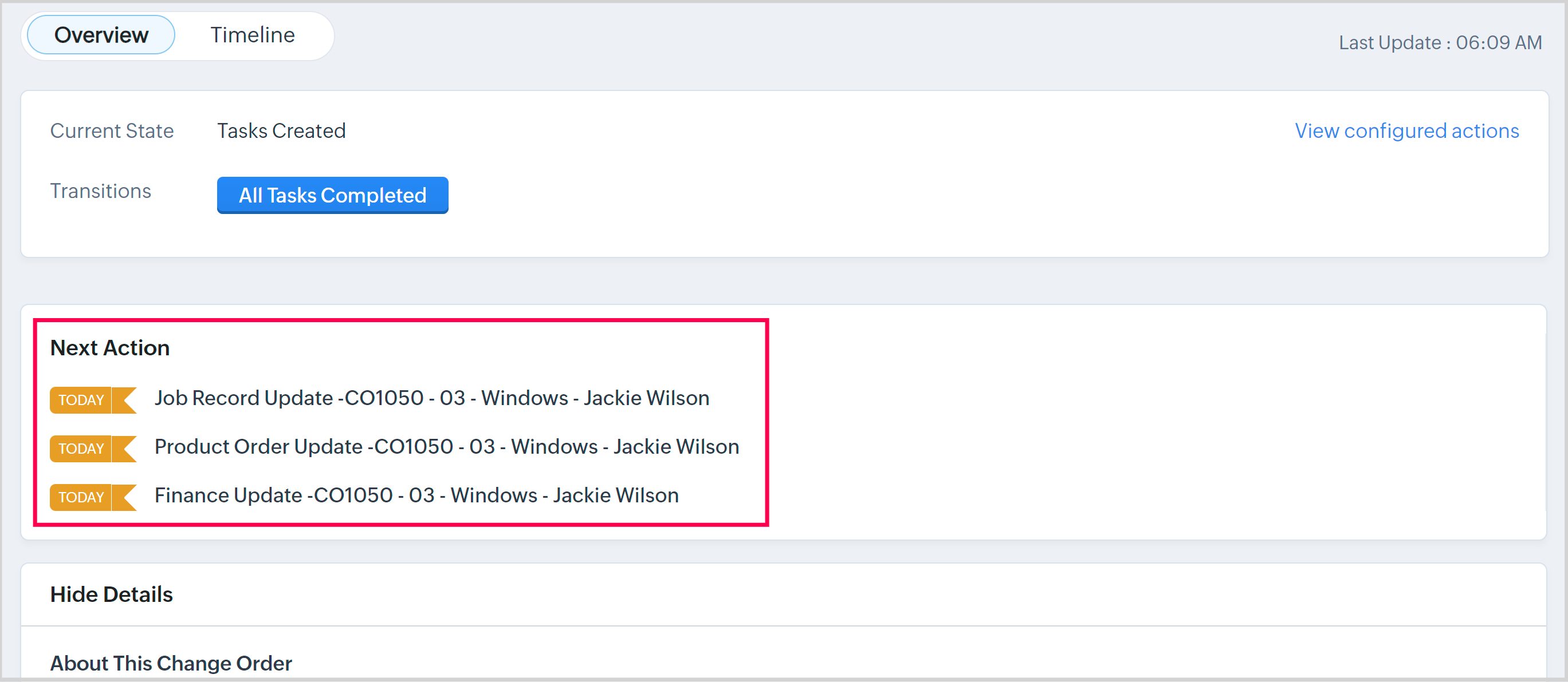 1. When tasks are added to a change order they will remain in the Next Action section until the respective tasks are completed.