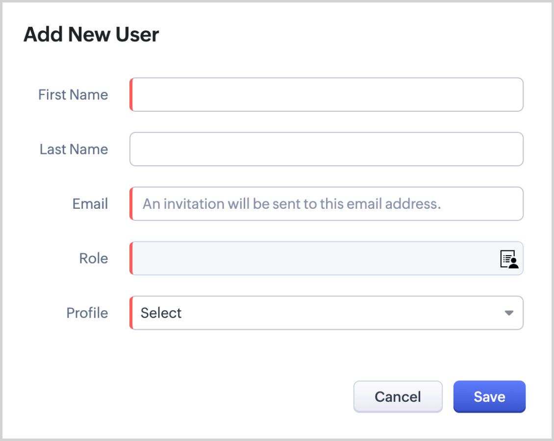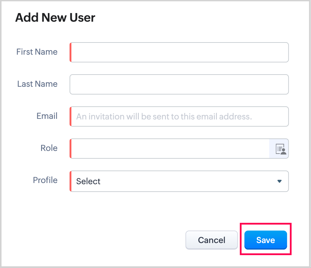 4. Enter the New User details, then Save. If you do not know which Profile and Role to assign to the user, please refer to our Profiles and Roles article.
