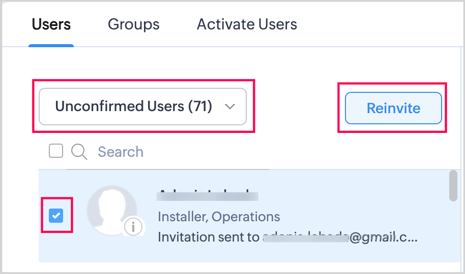 4. Click the Reinvite button to send resend the email invitation to the user's email address.