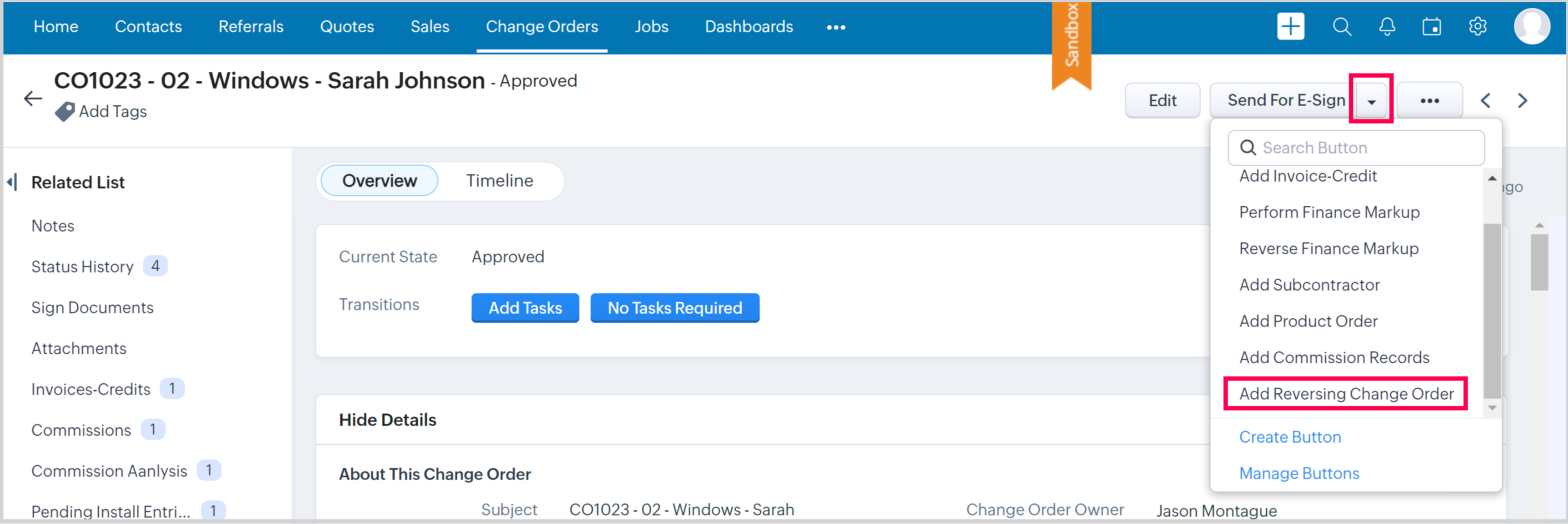 1. On a already approved Change Order, select the Add Reversing Change Order button from the action buttons in the top right hand section on the Change Order record.