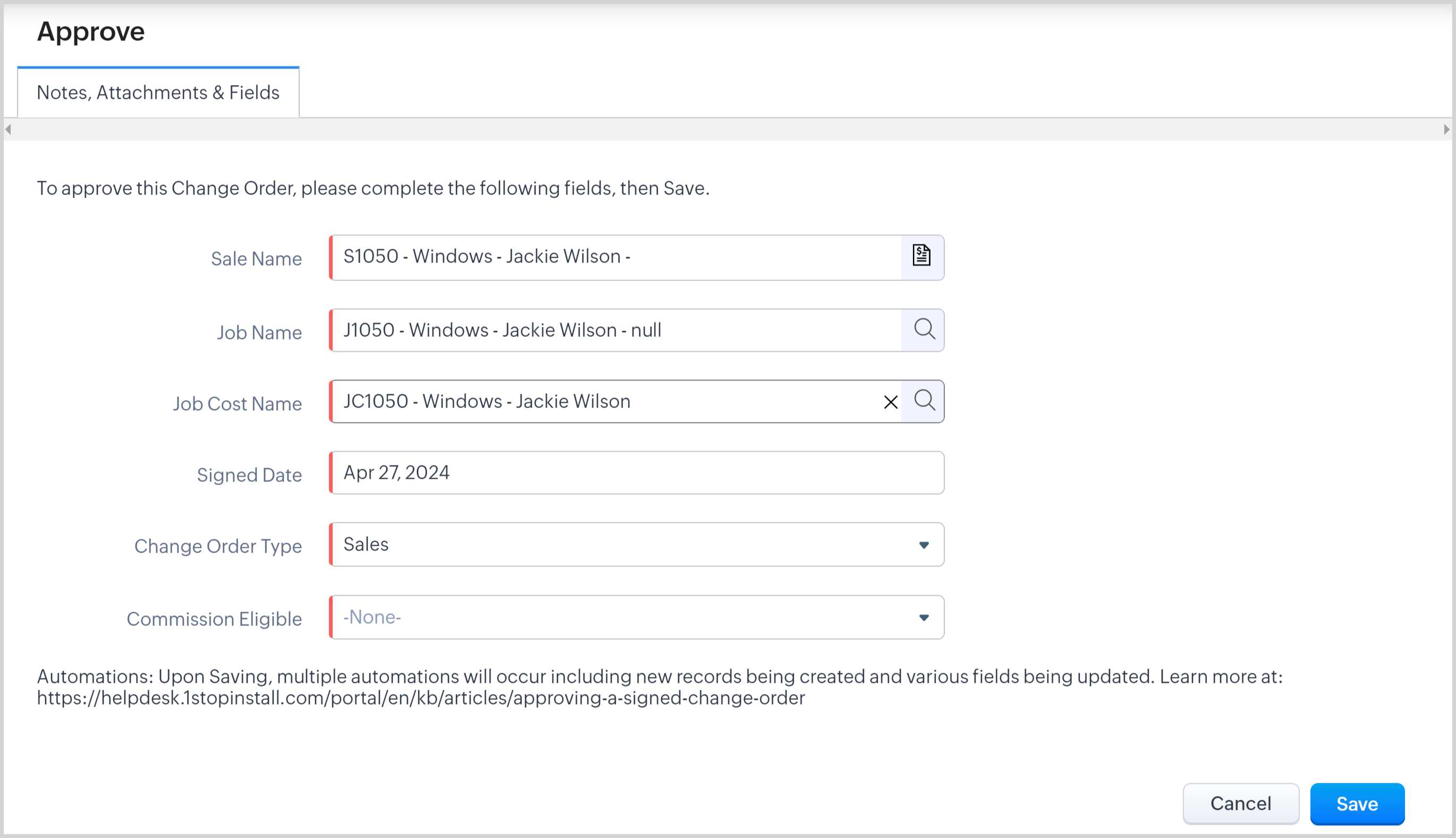 2. Complete fields and click Save (all fields must be completed). Upon Saving, the record will move to the Approved State. See below for field details and automations.