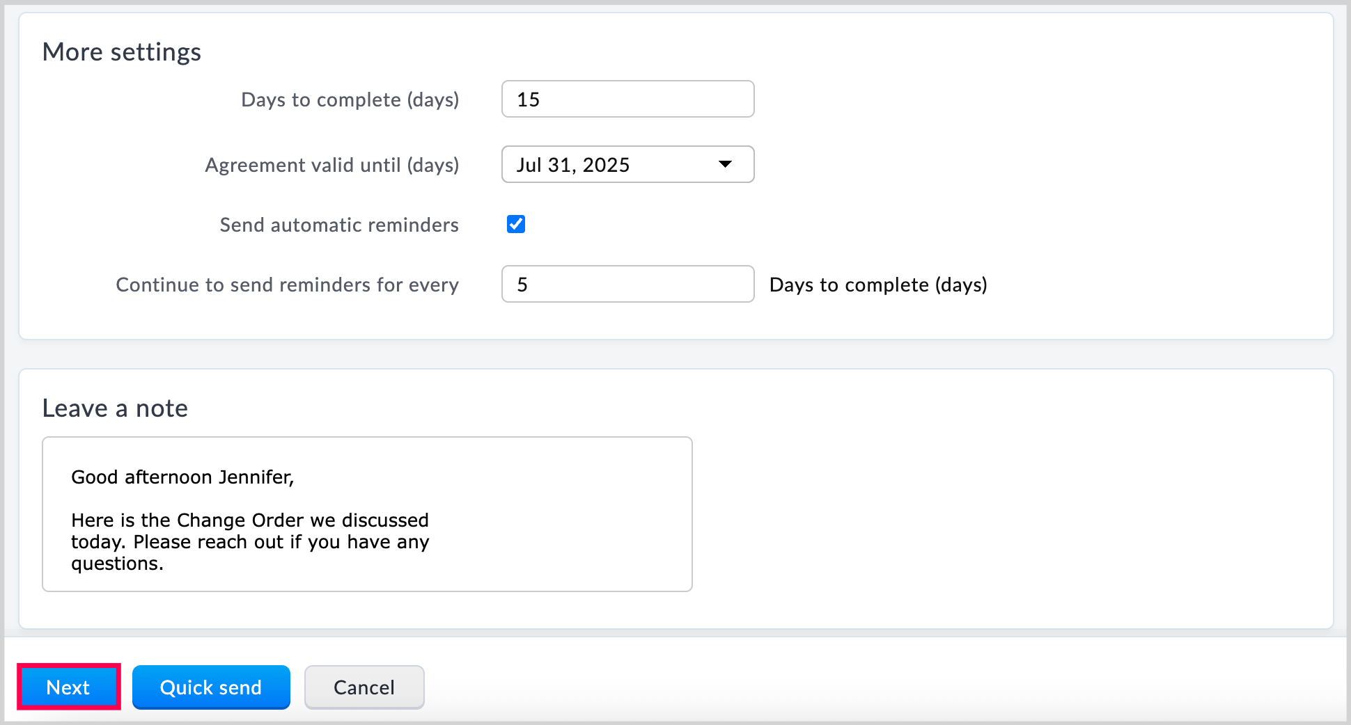 6. In the More Settings section, review and adjust any fields as needed. Add a note to include with the email, then click Next.