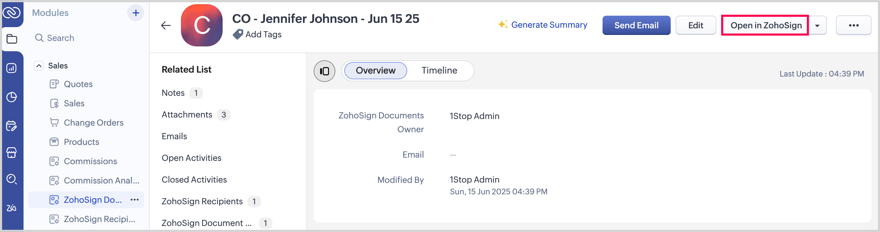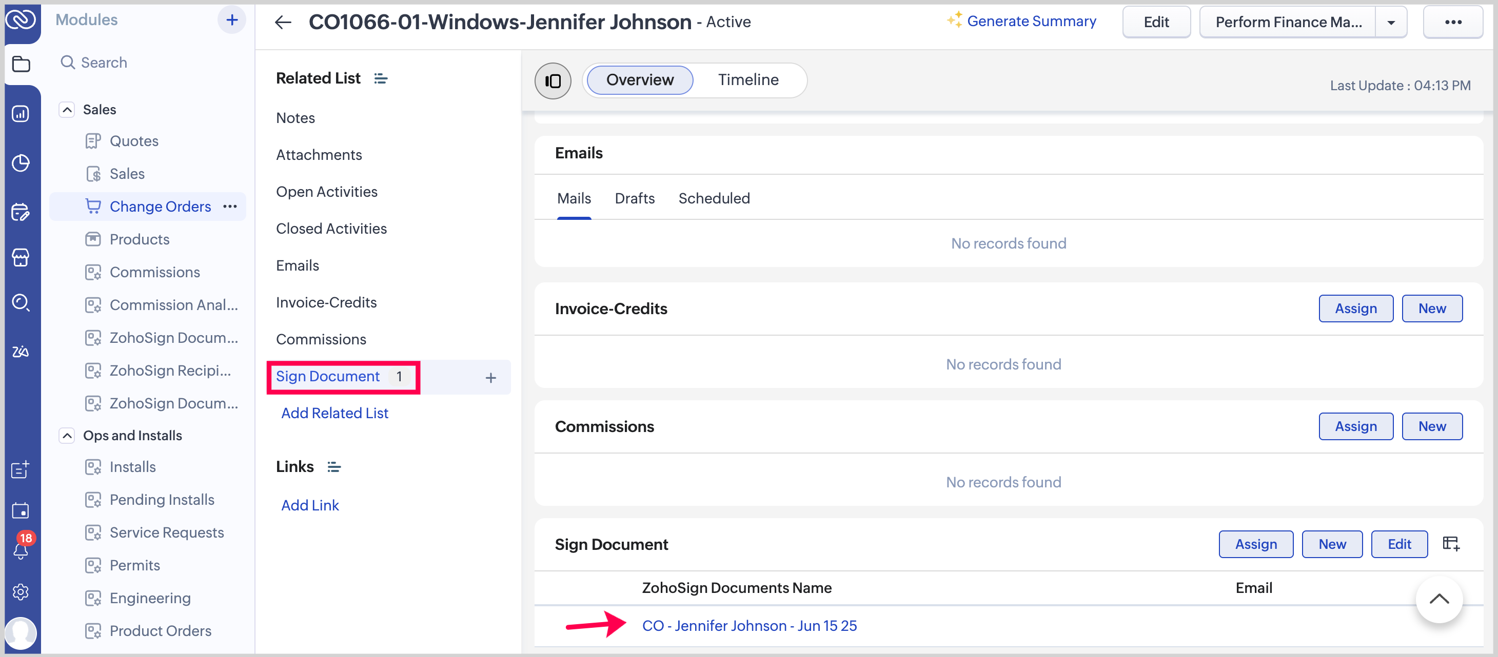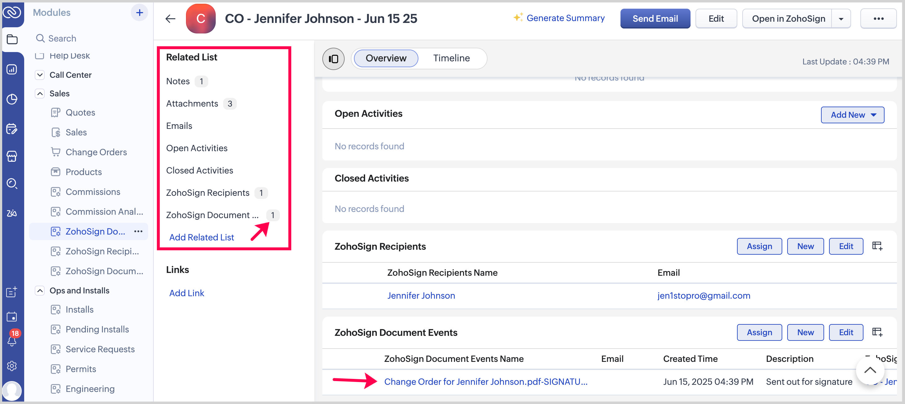 To view the Change Order after it’s been sent for signature, click ZohoSign Documents in the Related List, then select the Change Order from the list.