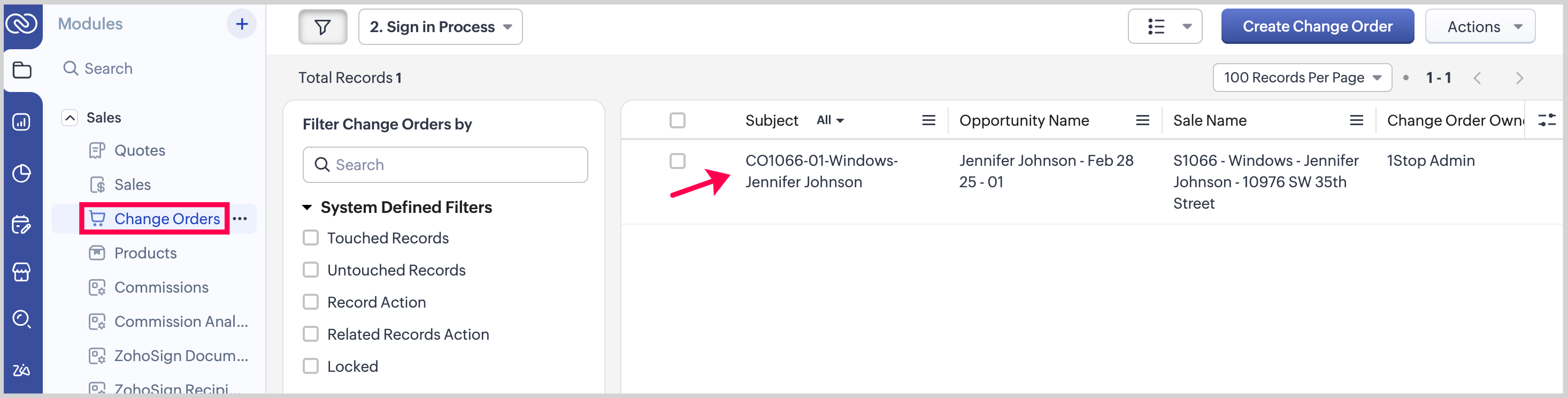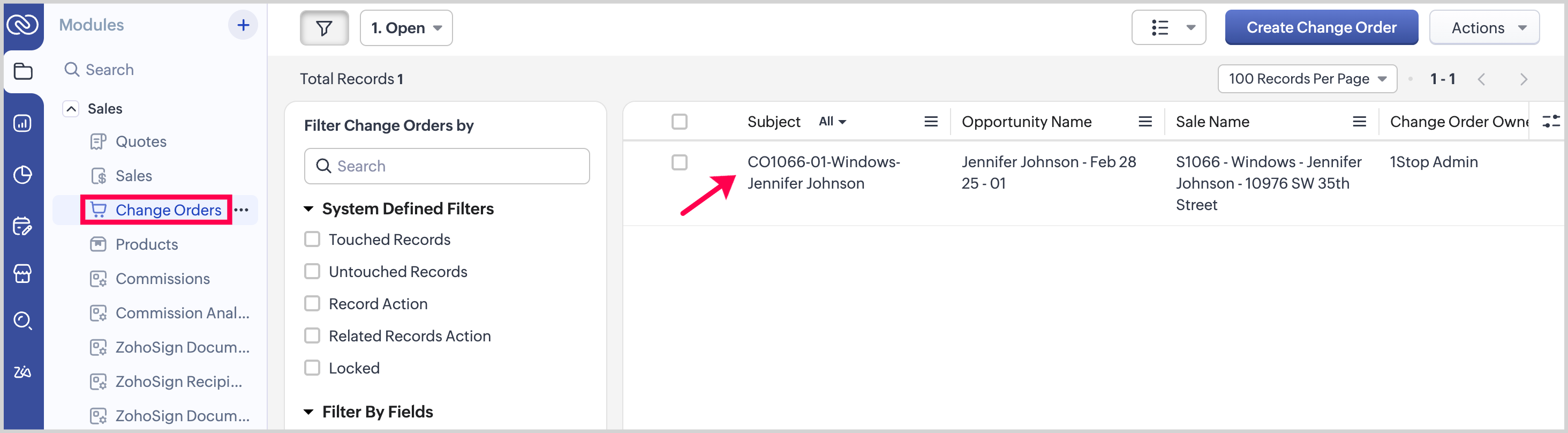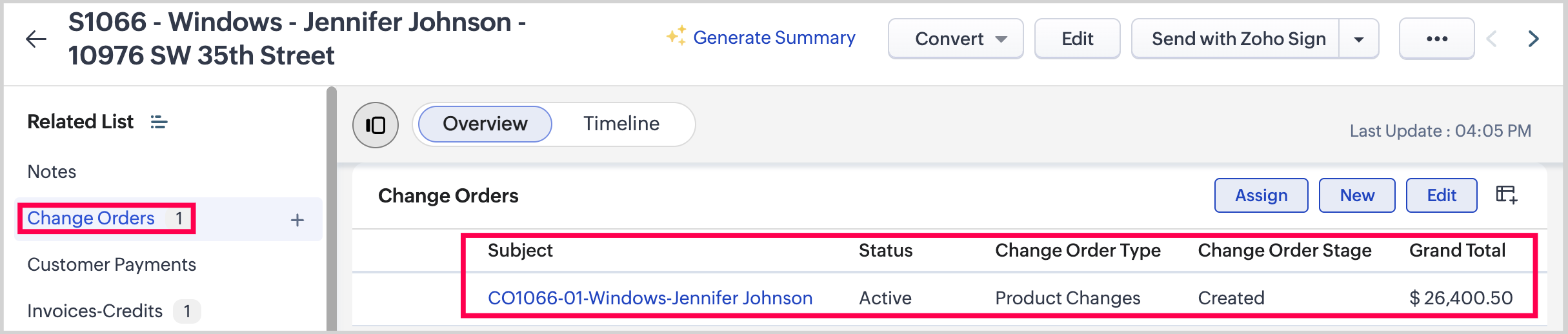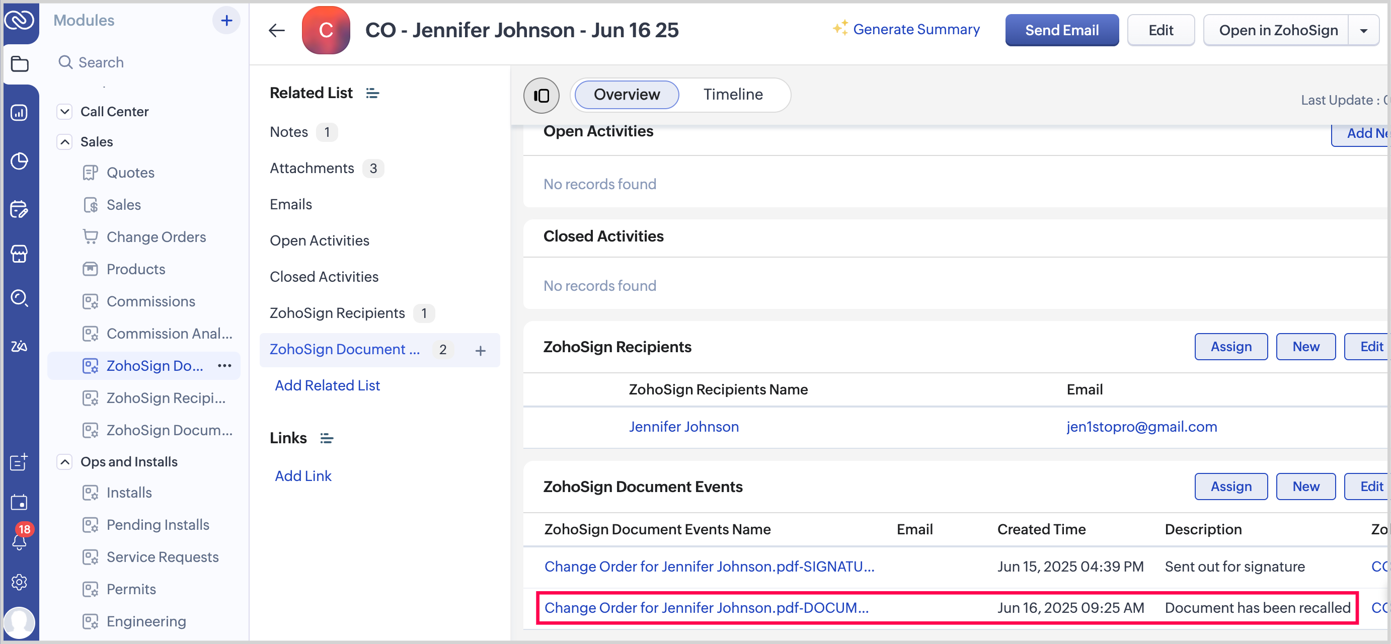 To view the Change Order after it’s been sent for signature, click ZohoSign Documents in the Related List, then select the Change Order from the list.