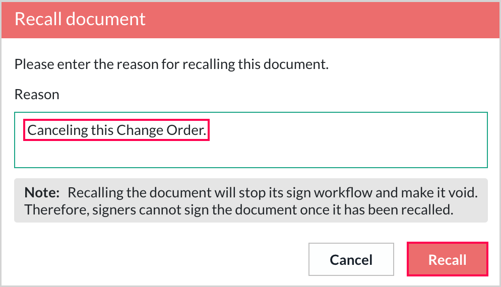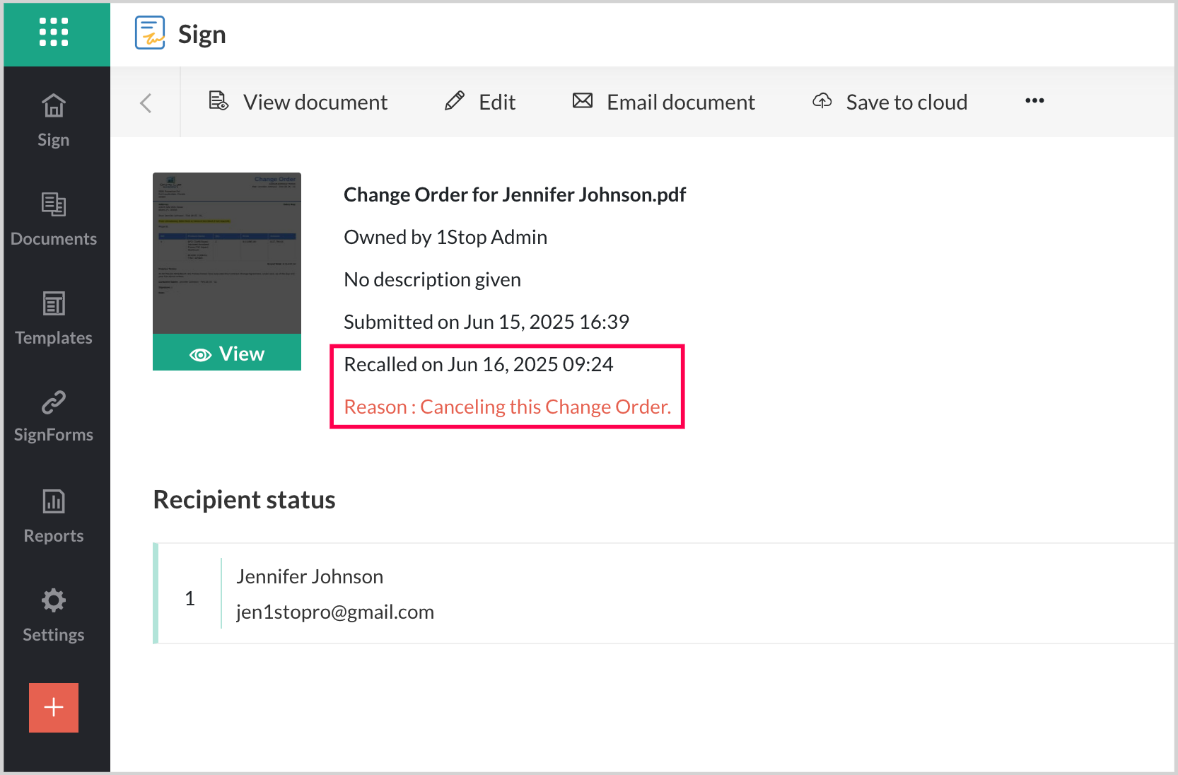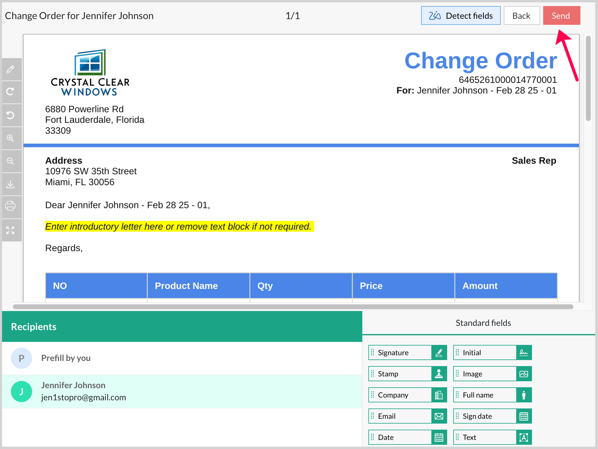 Once you have reviewed all fields and previewed the change order for accuracy, you can send it for digital signature.