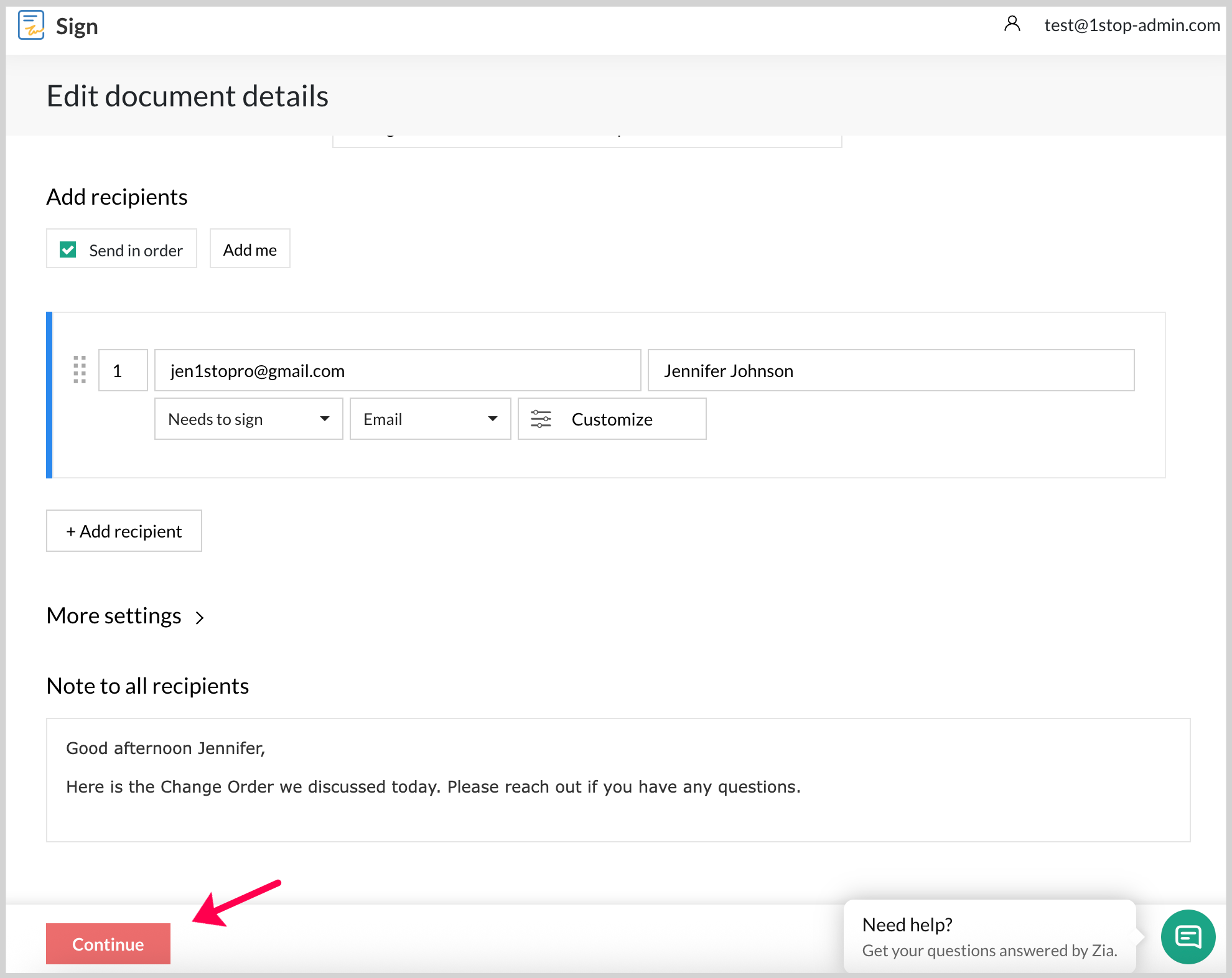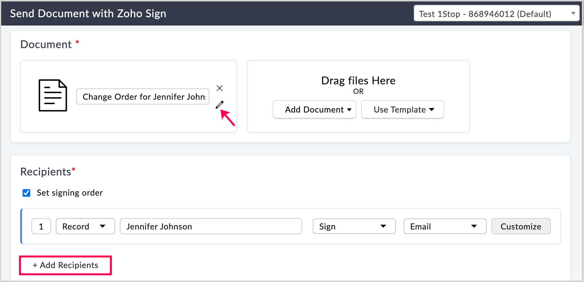 - The primary recipient will already be listed. To add more recipients, click the + Add Recipients button and enter their name and email address.