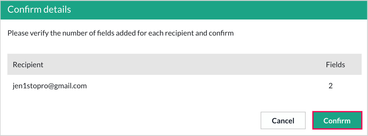 9. Verify the number of fields that need to be filled out (e.g., 2 fields: 2 signatures), then click Confirm.