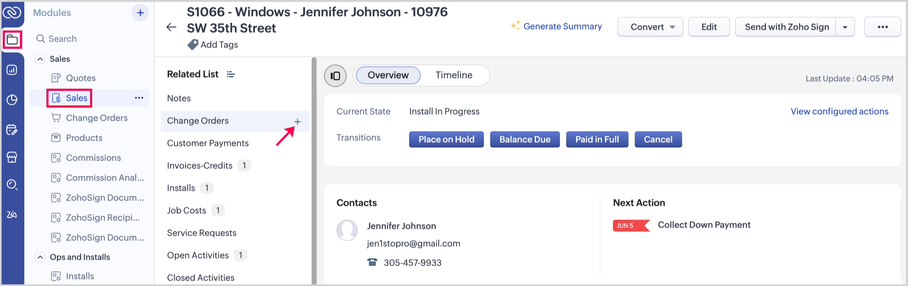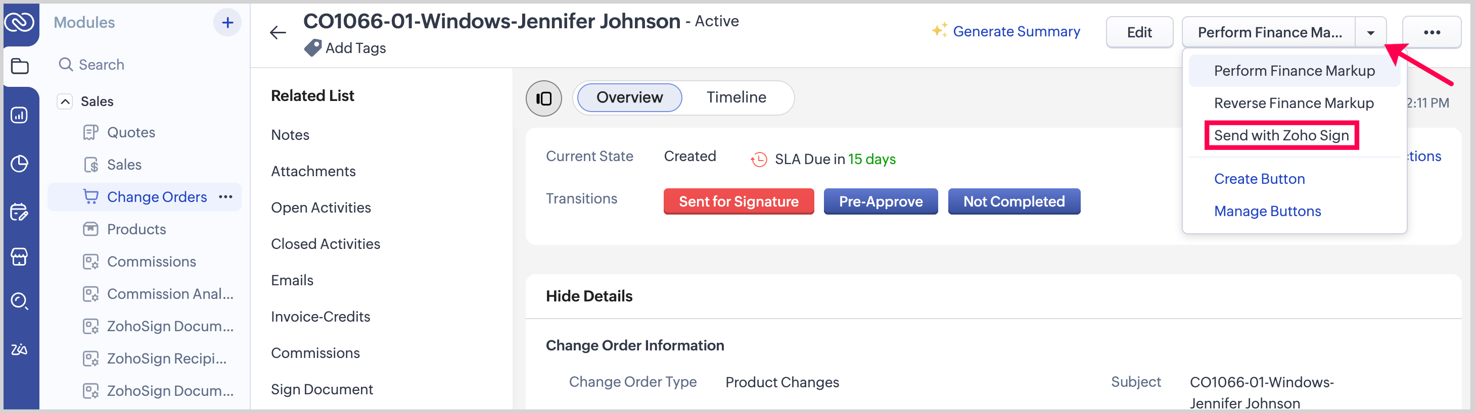 1. From the Change Order record you want to send, click the dropdown in the upper-right corner and select Send with Zoho Sign.