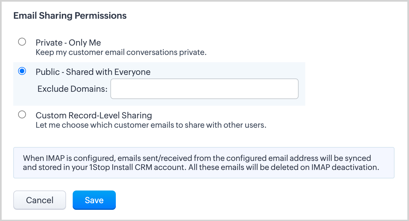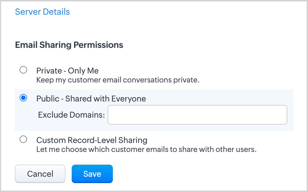 9. Click Public so that everyone in the organization can see the emails associated with the Contact record. You may want to hide interoffice emails, if so, exclude your own company domain, then click Save.
