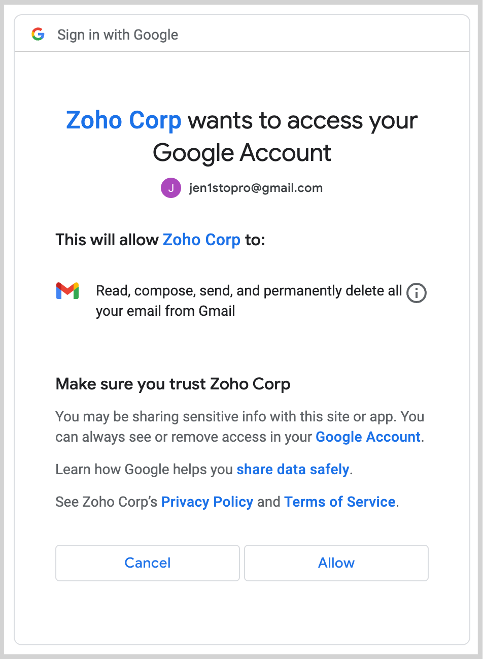7. Click Allow in the next pop-up screen to allow Zoho to access your account.