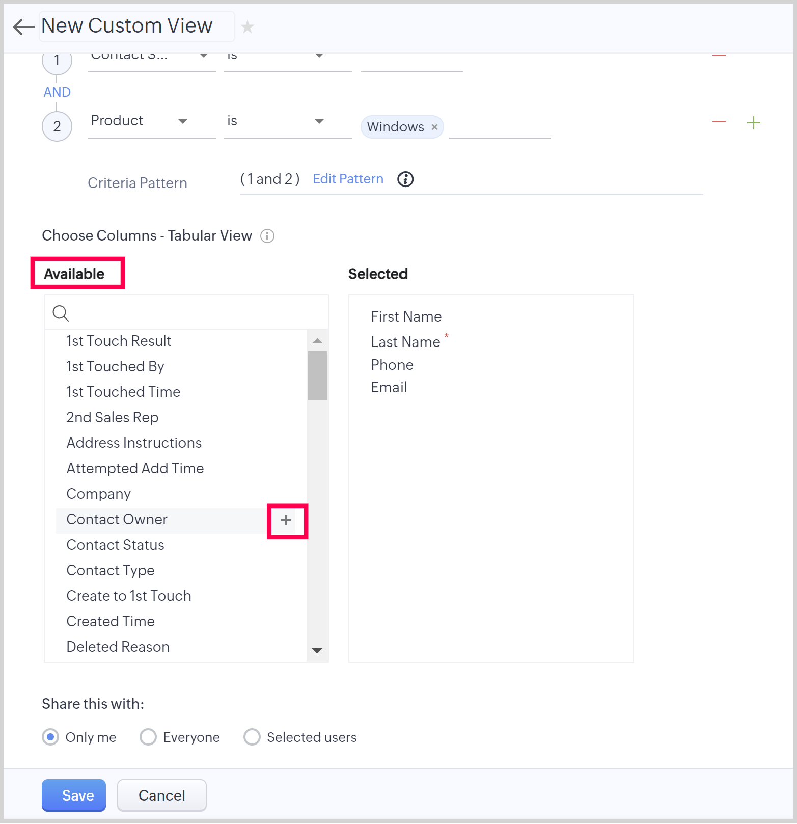6. To add a Column to the Custom View, hover over the field you want to add in the Available section and click on the + sign that appears.