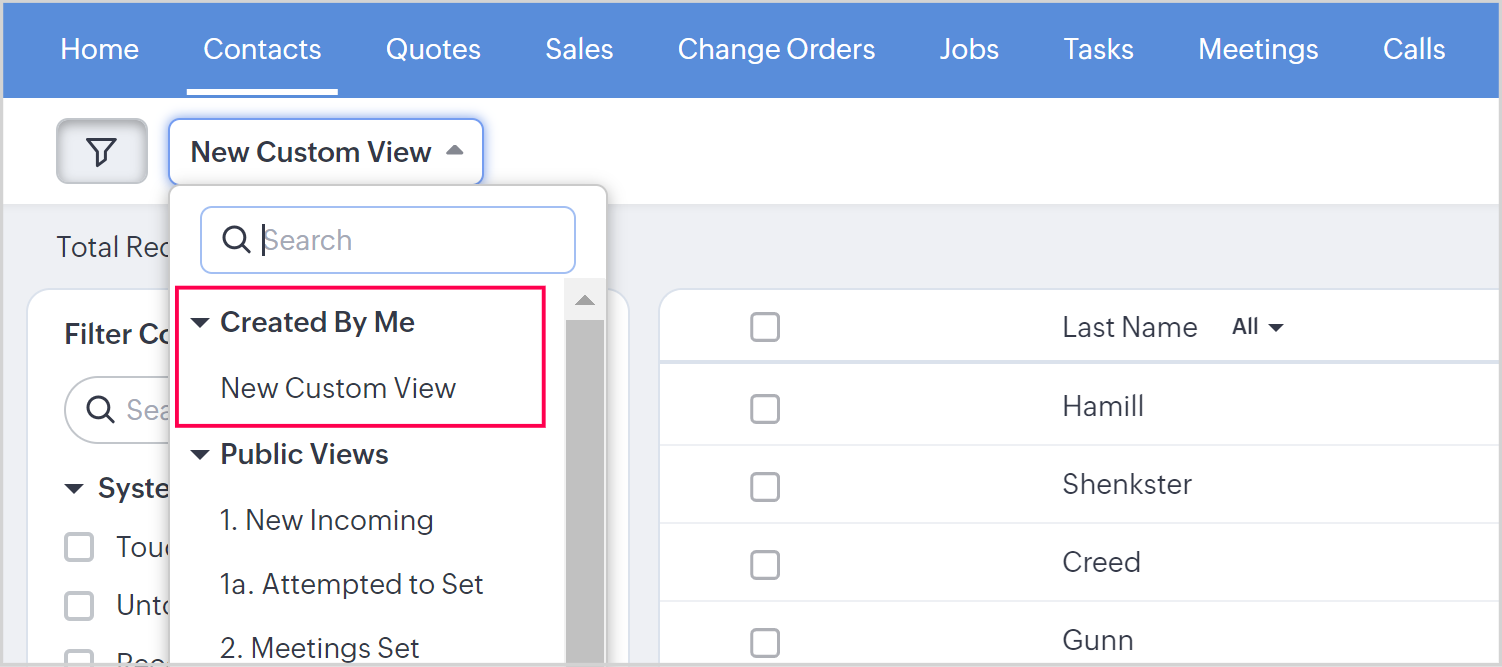 9. After saving, a new Custom View will be created. Please note that the Custom View will appear in your "Created By Me" section, as you are the one who created it. However, for everyone else, the Custom View will be displayed in their "Public View" section.