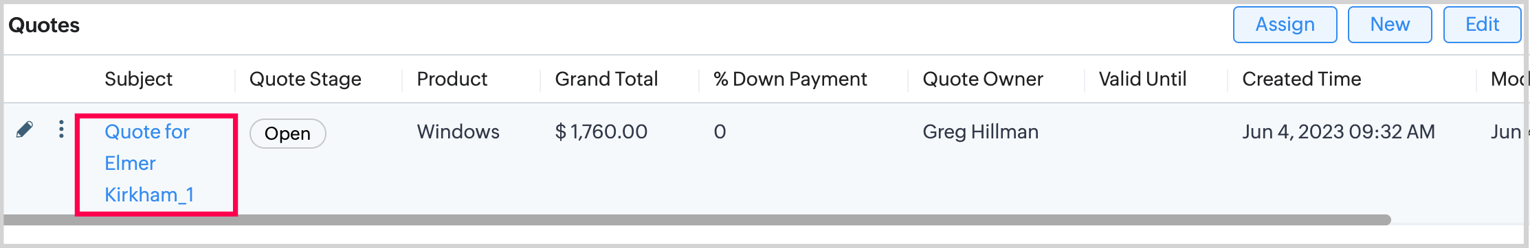 - Quote Subject - Populated with naming convention "Quote for [Contact Name]_[Number of Quotes]". Number of Quotes is updated to the sum of the existing quotes prior to creation plus 1.