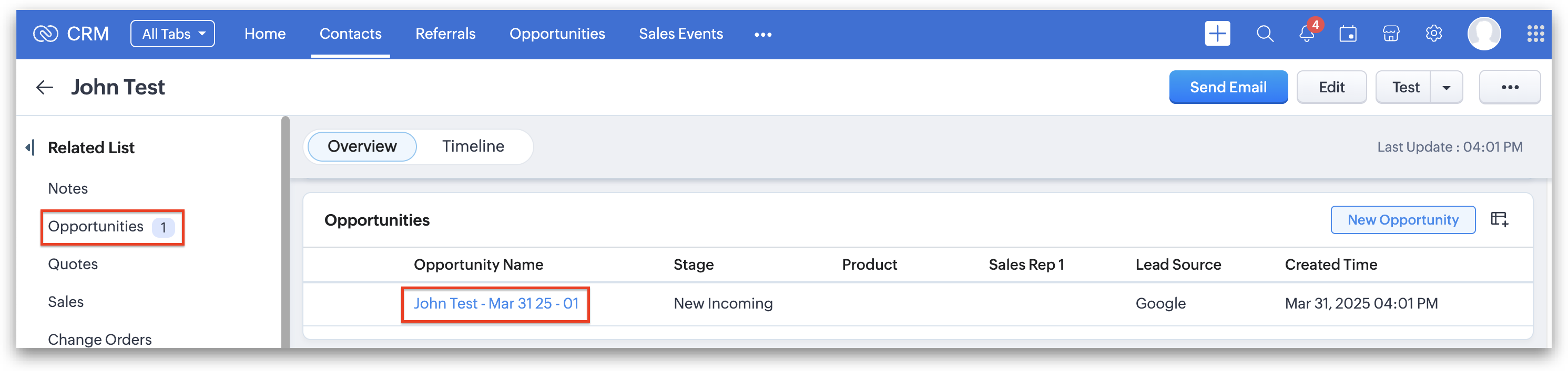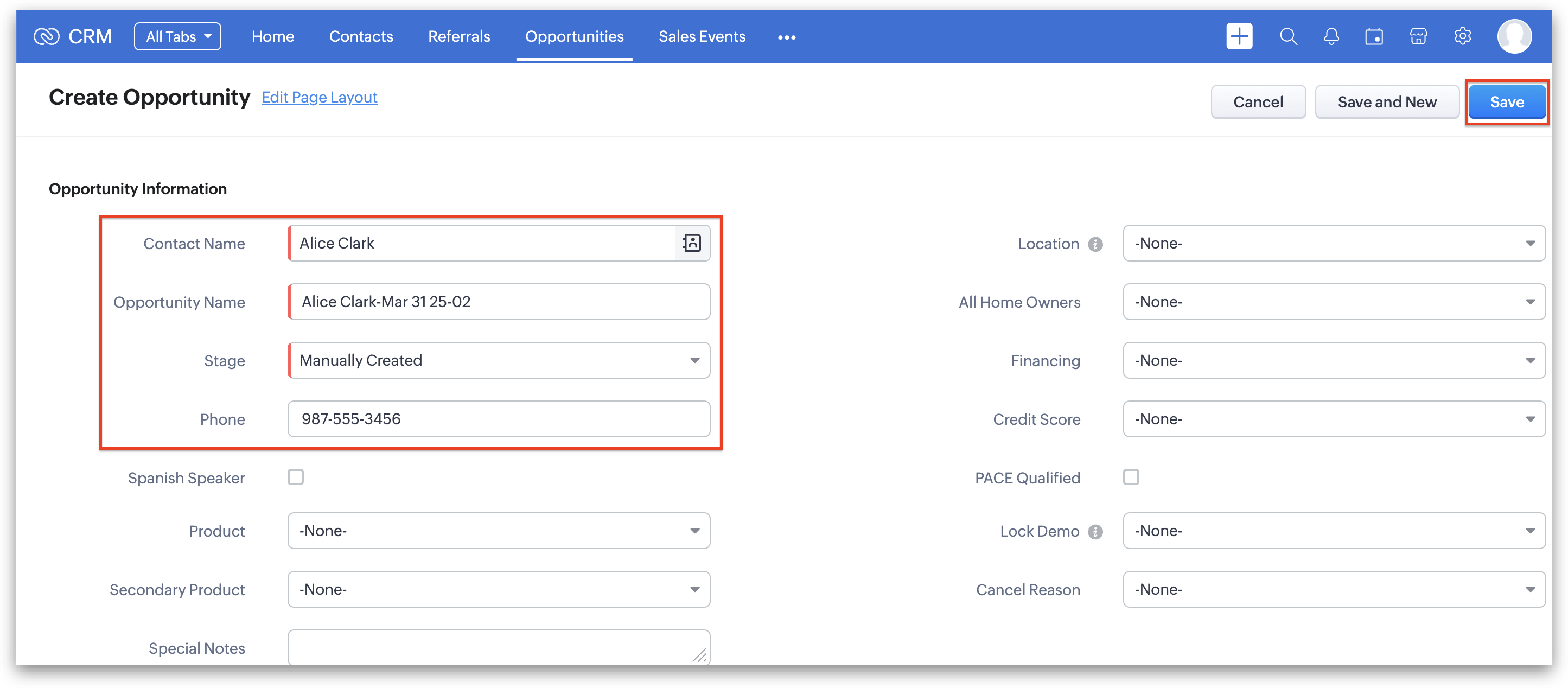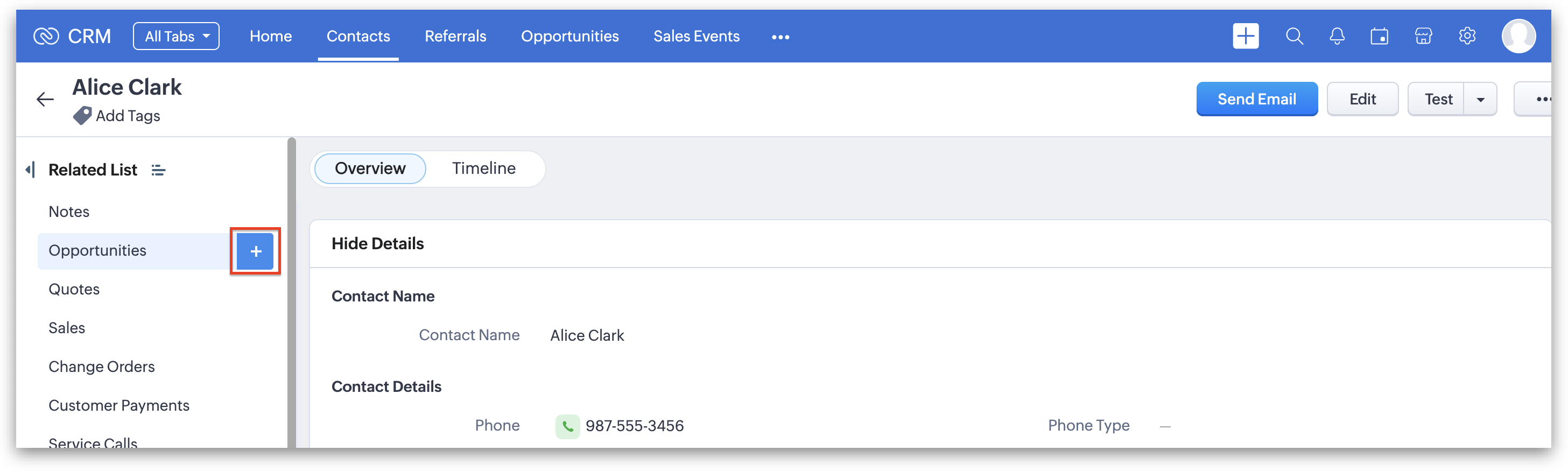 1. While Opportunities are automatically created when a Contact is created, if you receive an inbound phone call from an existing Contact and need to manually create an Opportunity, simply click the + symbol after the "Opportunities" in the Related List of that Contact.
