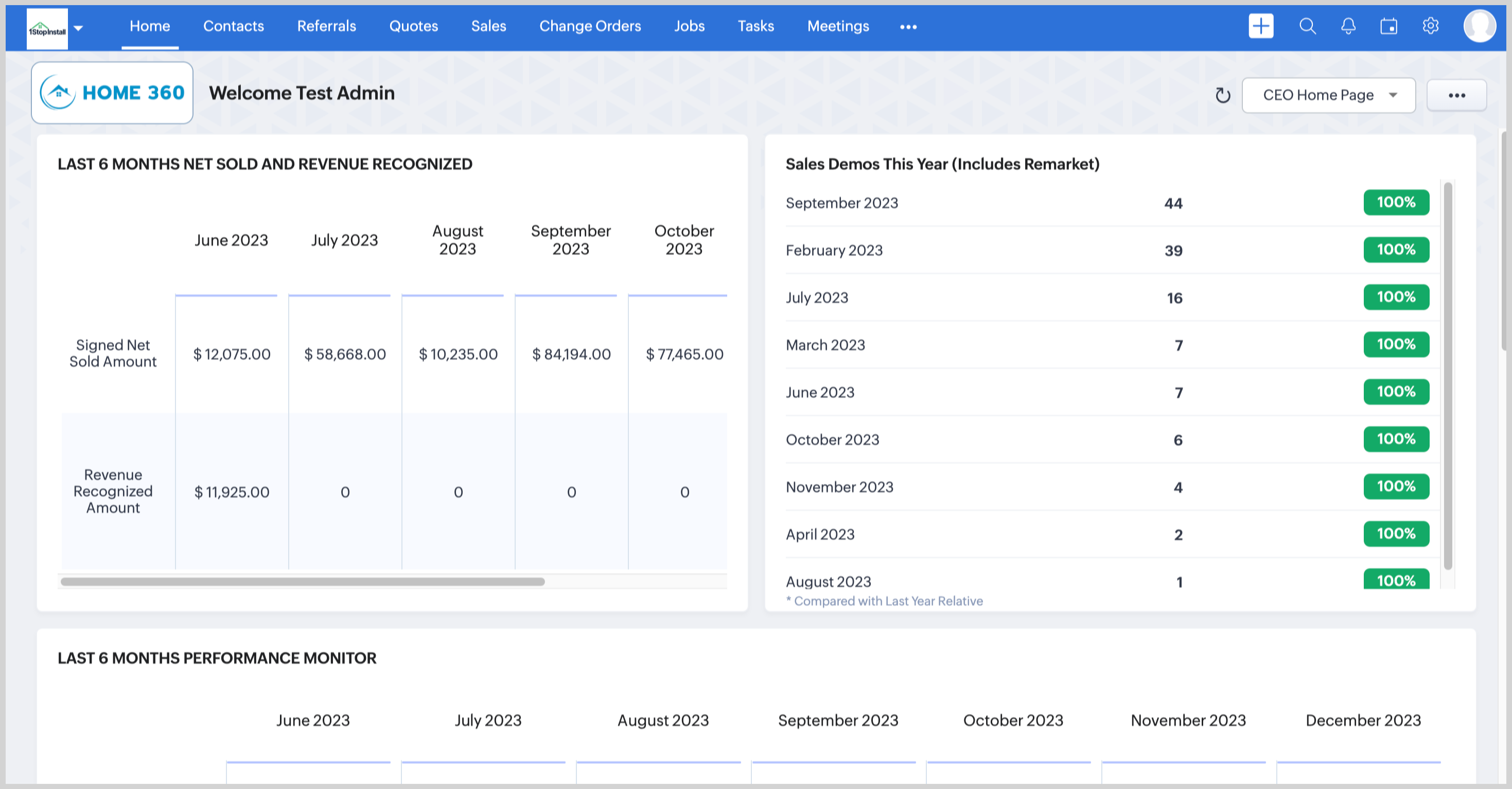 In 1Stop, the home page provides a quick overview of your CRM activities' progress, featuring components from various modules like Dashboards, Tasks, and more. A brief glance at the home page components instantly reveals the status of your sales activities.