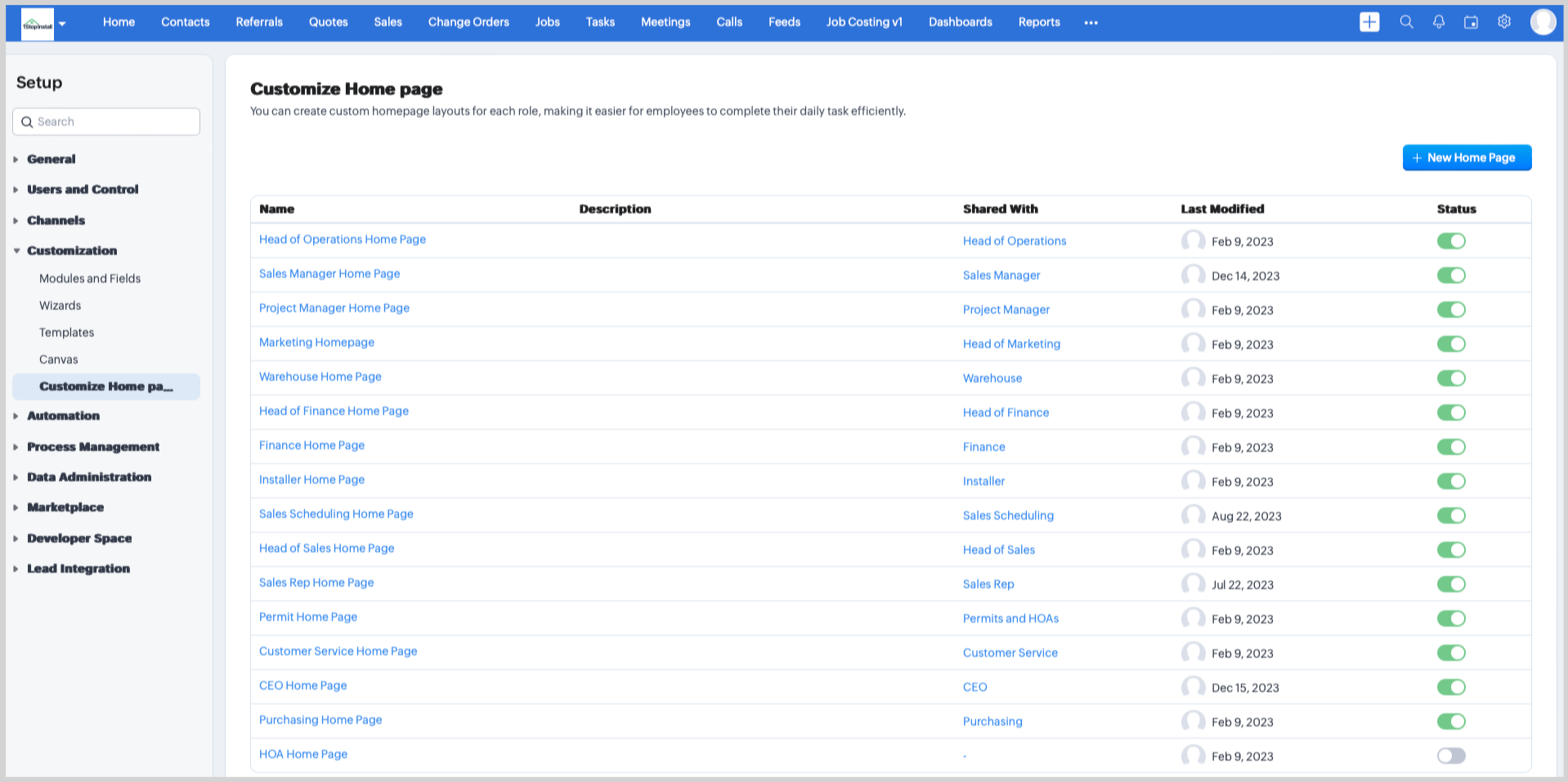 The Custom Homepage organizes all of the key activities users need to do their Job in one place. Each homepage features different components from various modules based on a user's role within the organization, ensuring its relevant to their day-to-day responsibilities. When a user logs in, they'll immediately land on their Custom Homepage to see all of the activities relevant to them. From here, they can jump to different areas of 1Stop based on their priorities for that day.