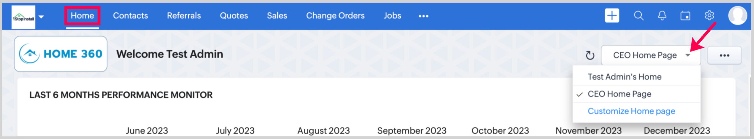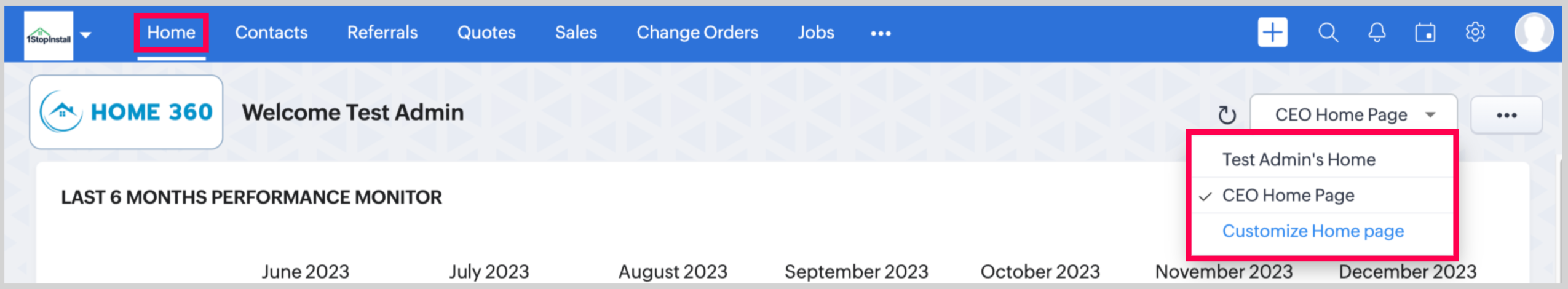 Upon logging in, users will find their role-specific customized home page displayed by default. Users can easily switch between different home page views as needed by accessing the drop-down list located in the top right corner under the Home Tab.