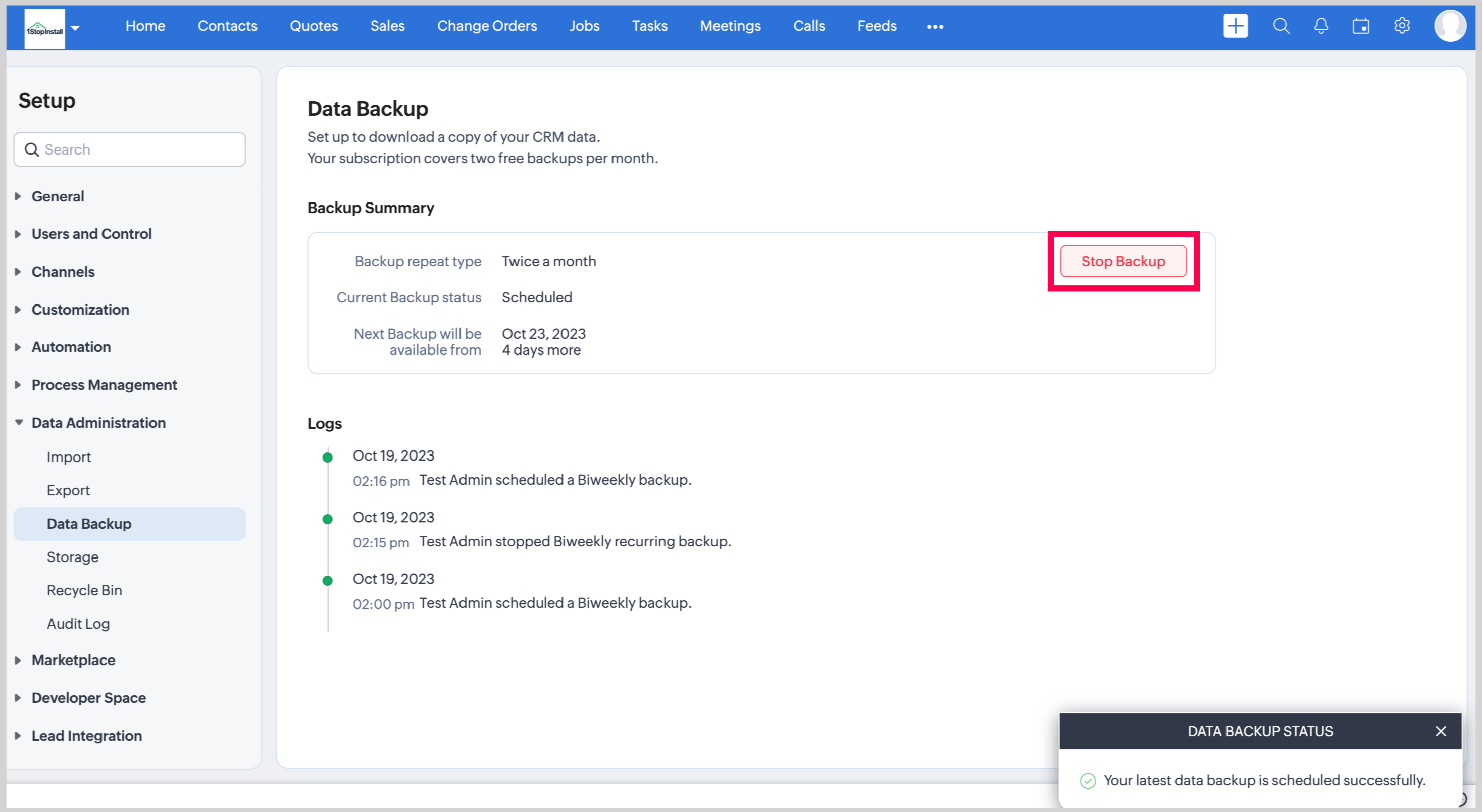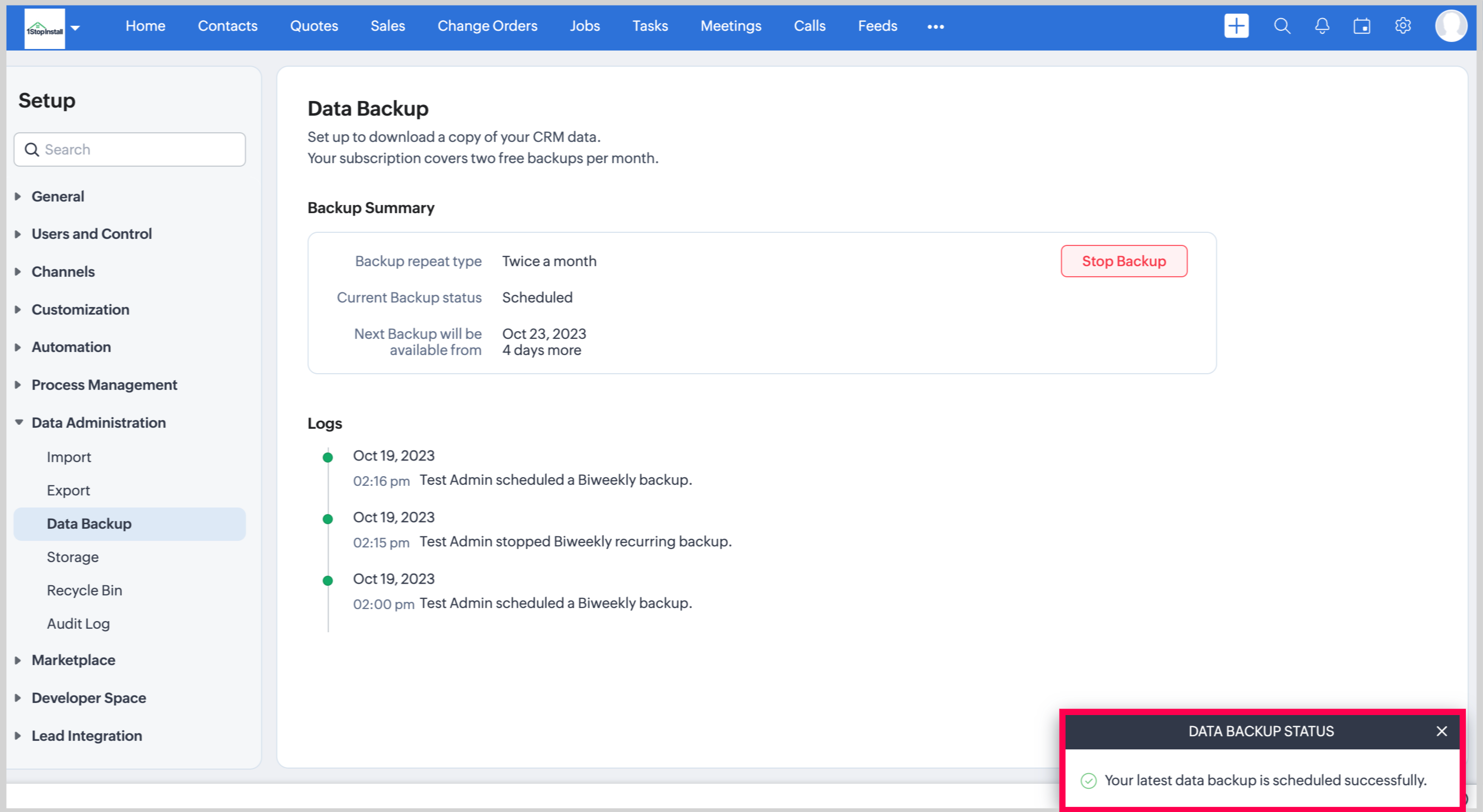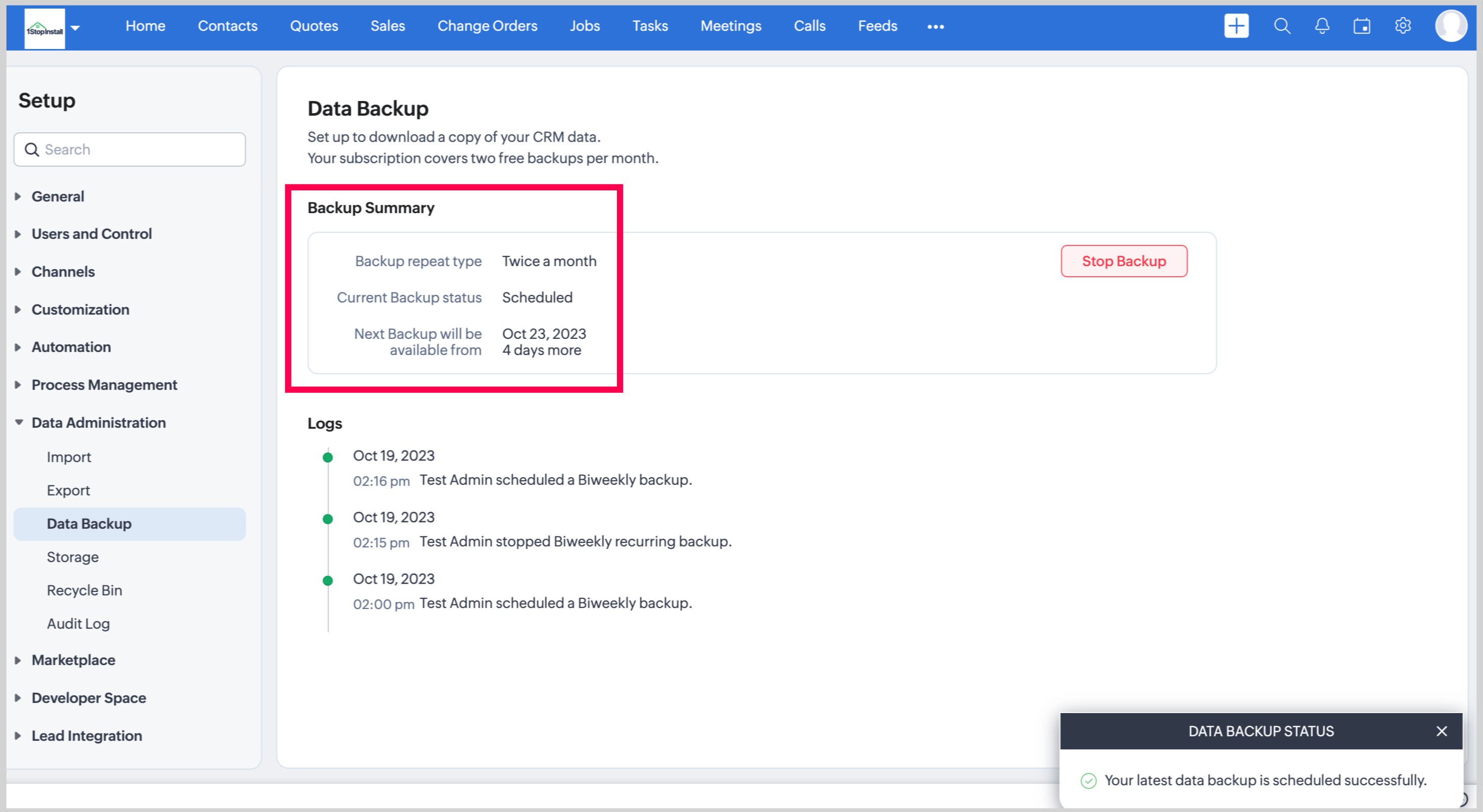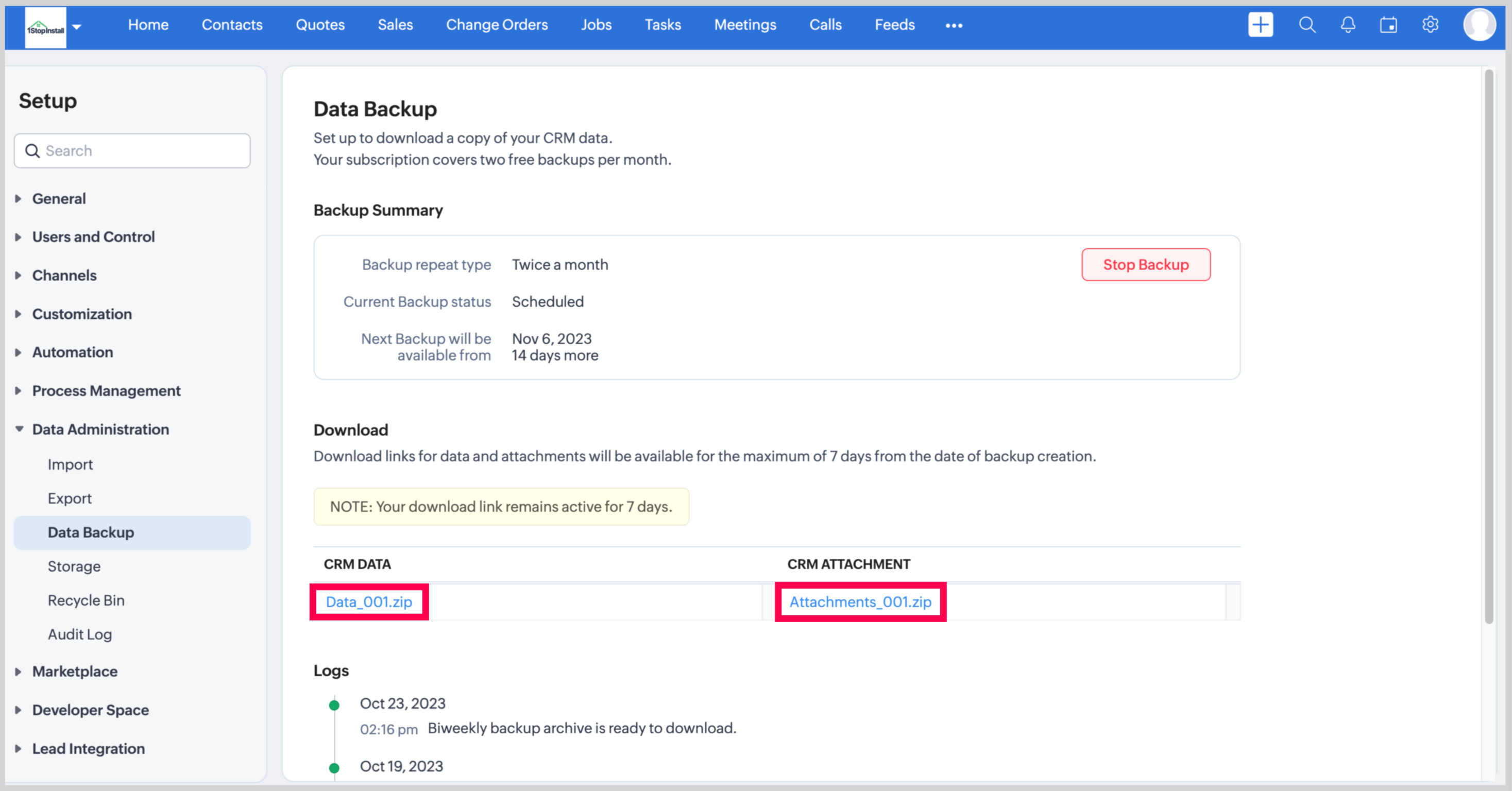 Once the data backup is ready, the user with administrative privileges can download it. The data and the attachments will be grouped into separate .zip folders.