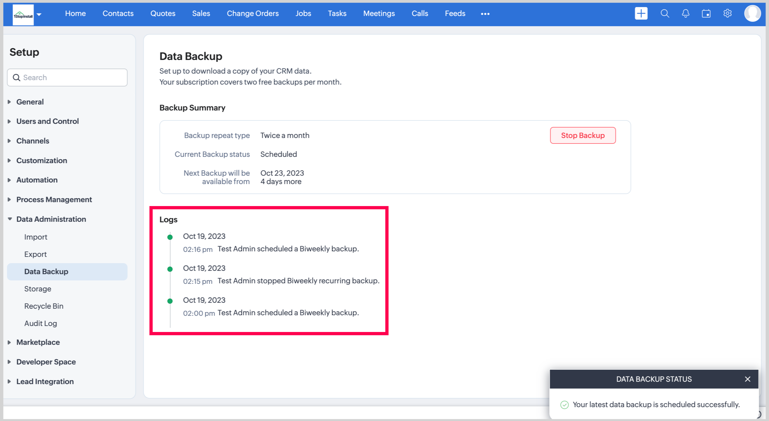 The chronological sequence of action performed, pertaining to data backup will be listed in the Backup Logs. They include:
