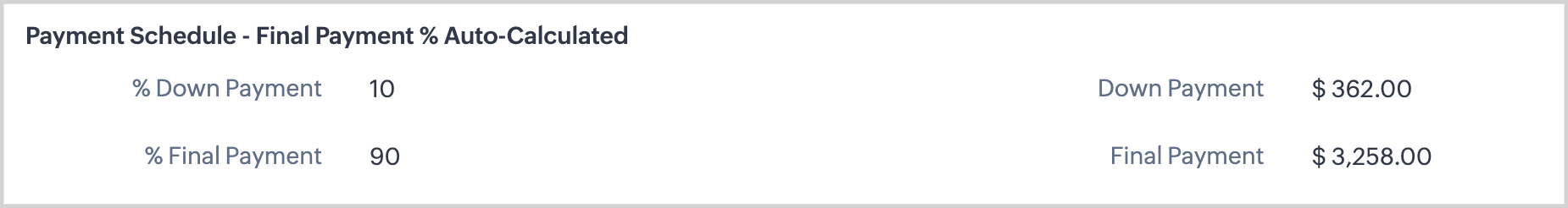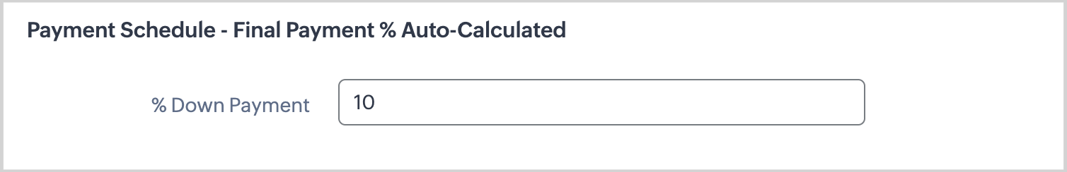 - Ensure % Down Payment field is entered as a whole number. After Saving, fields for the Down Payment Amount, Final Payment Amount and % Final Payment will auto-calculate and display on the Quote Record.
