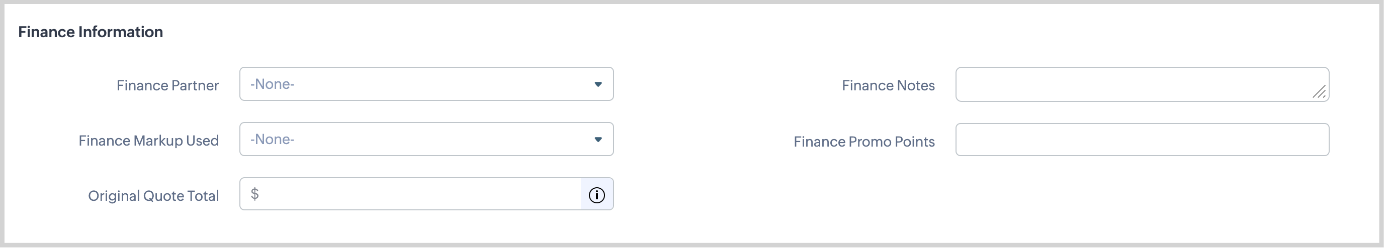 - Original Quote Total - this field is auto populated with the original Quote Grand Total amount after you complete the Finance Markup Process.