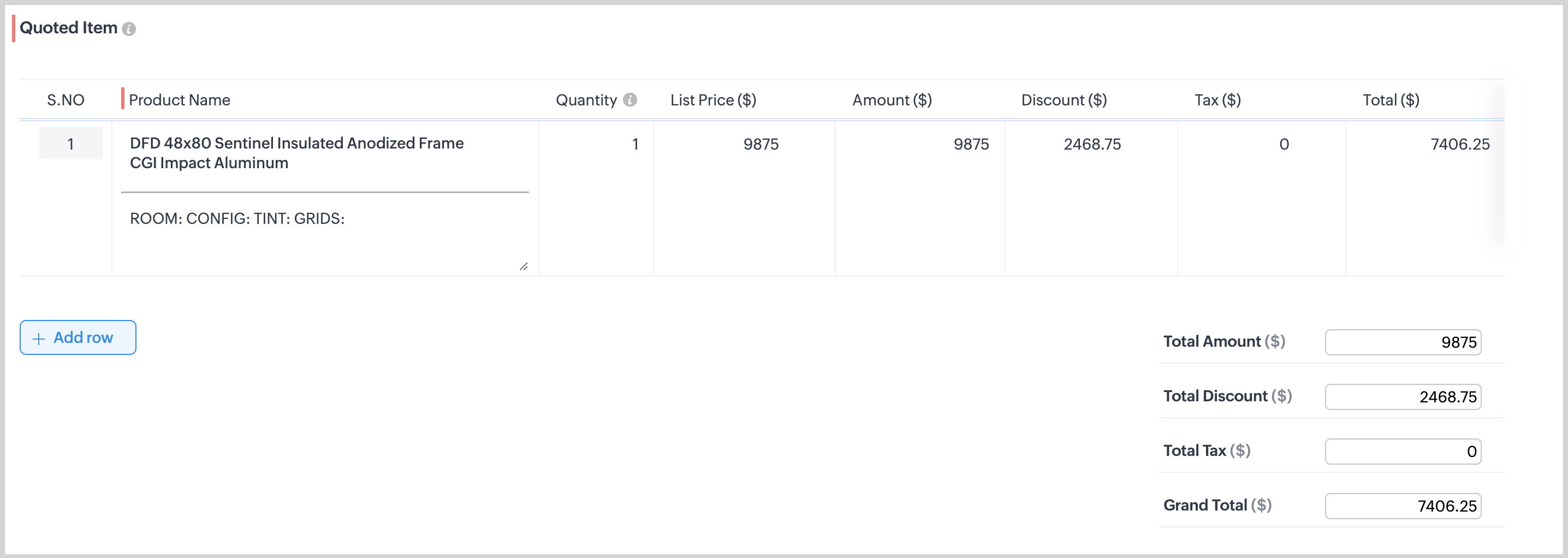 - Click Add row button to continue to add or edit Quoted Items