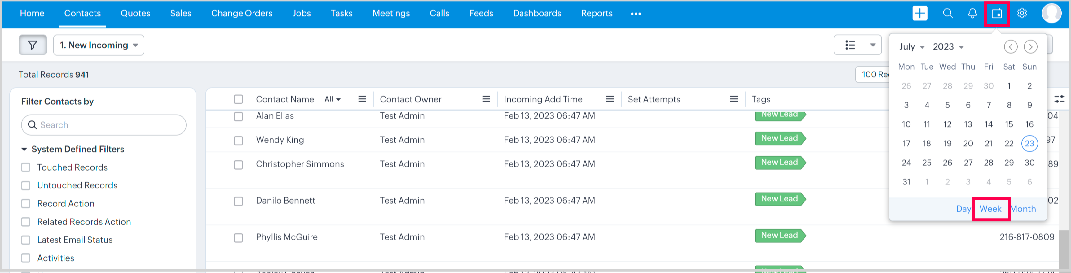 1. Click the Calendar icon in the top right of the page and select Week at bottom of calendar.