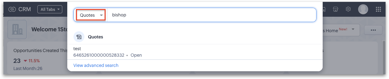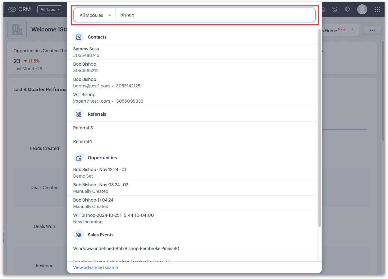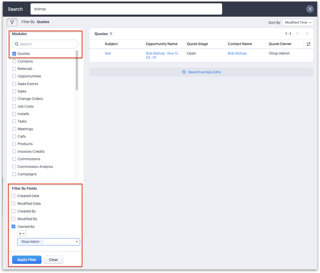 4. Clicking View Advanced Search will allow you to further search across multiple modules of your choosing, with the ability to filer those results by Created Date, Modified Date, Created By, Modified By or Owned By, to further narrow your search results: