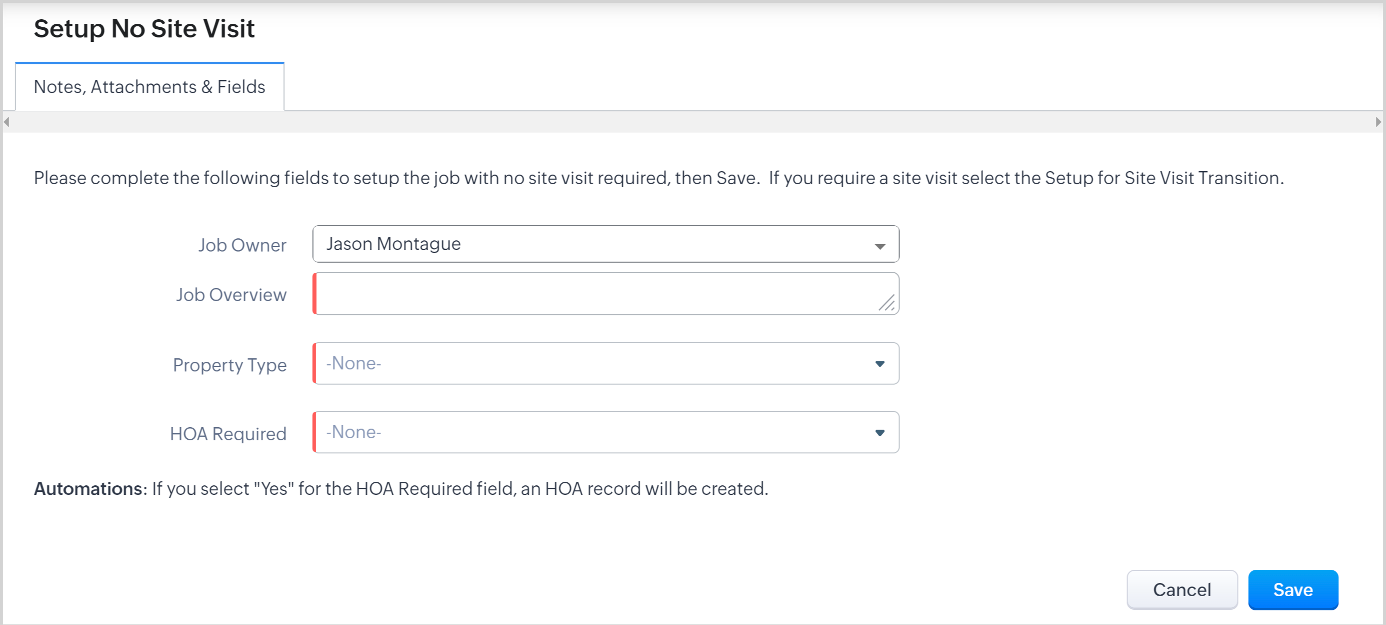 2. Complete fields and click Save (all fields must be completed). Upon Saving, the record will move to the No Site Visit Required State. See field details below image.