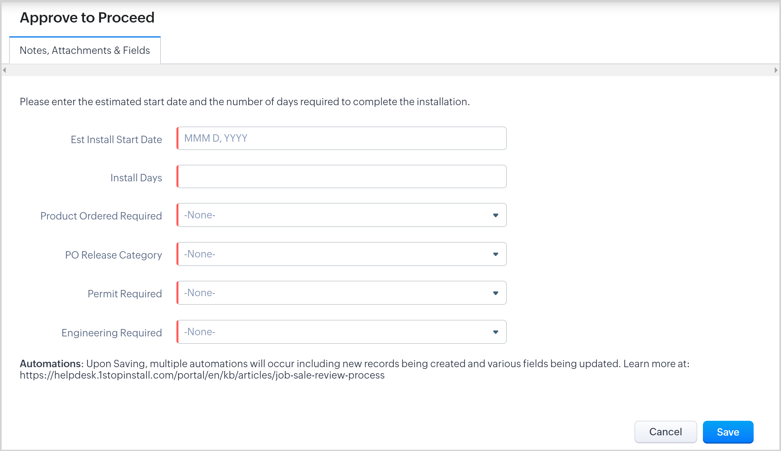 6. Complete fields and click Save (all fields must be completed). Upon Saving, the record will move to the Approved to Proceed State. See field details below image and see Automations after Approved to Proceed section below for overview on all automations that occur after Saving.