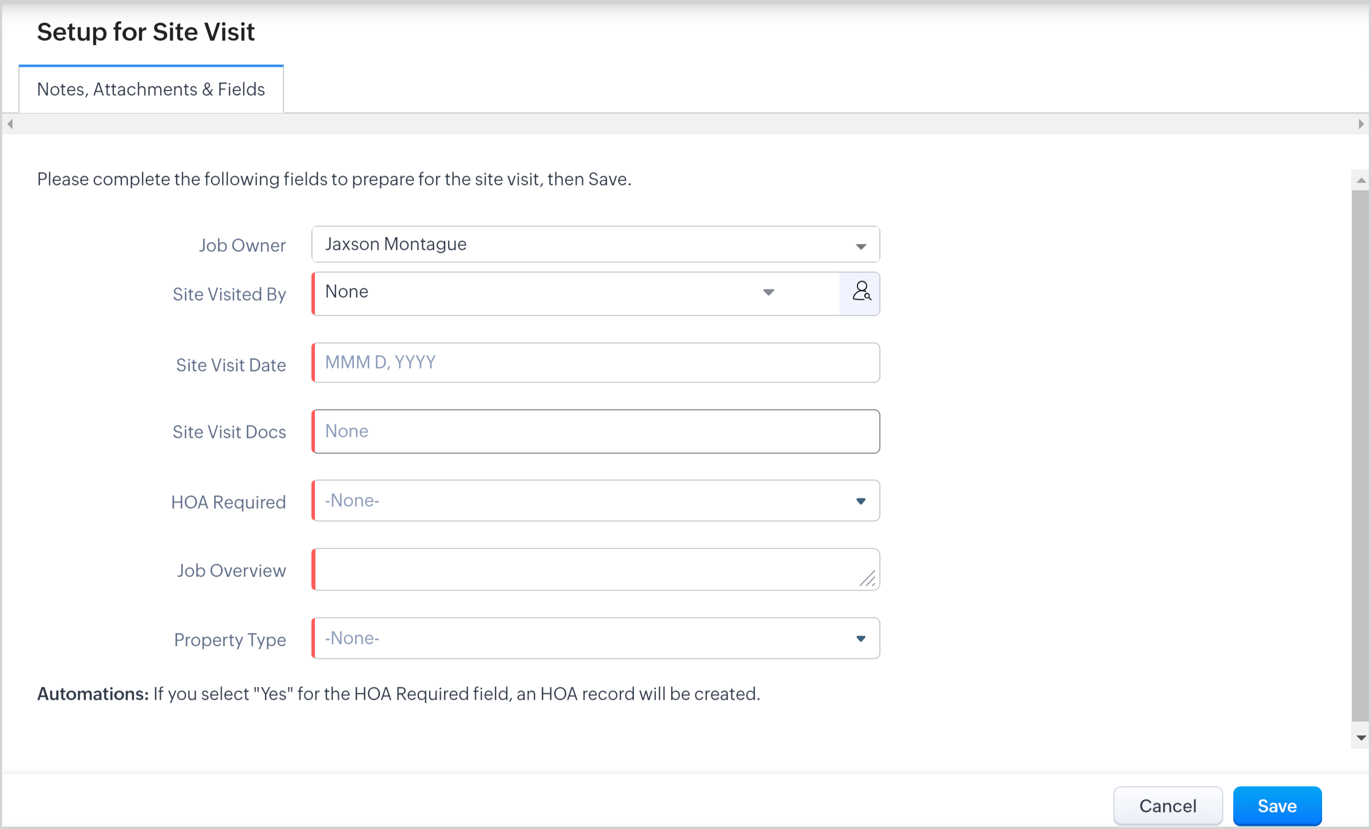2. Complete fields and click Save (all fields must be completed). Upon Saving, the record will move to the Ready for Site Visit State. See field details below image.