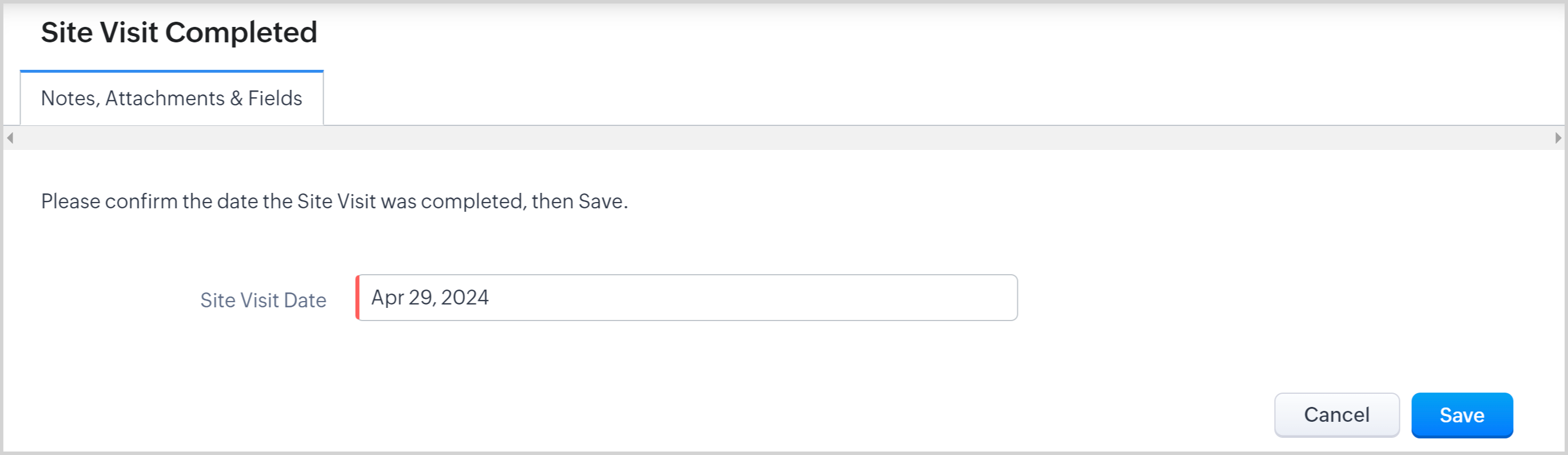 4. Confirm or update the Site Visit Date and click Save. Upon Saving, the record will move to the Completed Site Visit State.