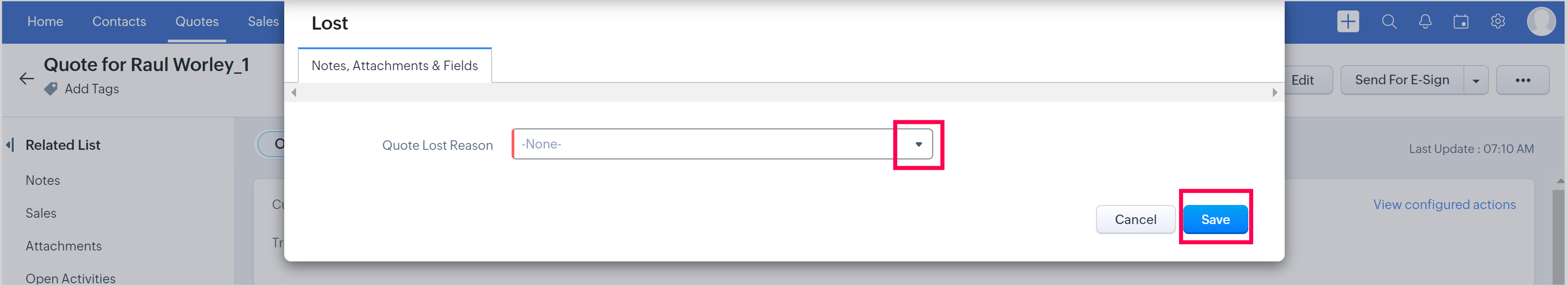 2. Select the Quote Lost Reason from the drop-down menu, then Save. The Quote will move to Lost.