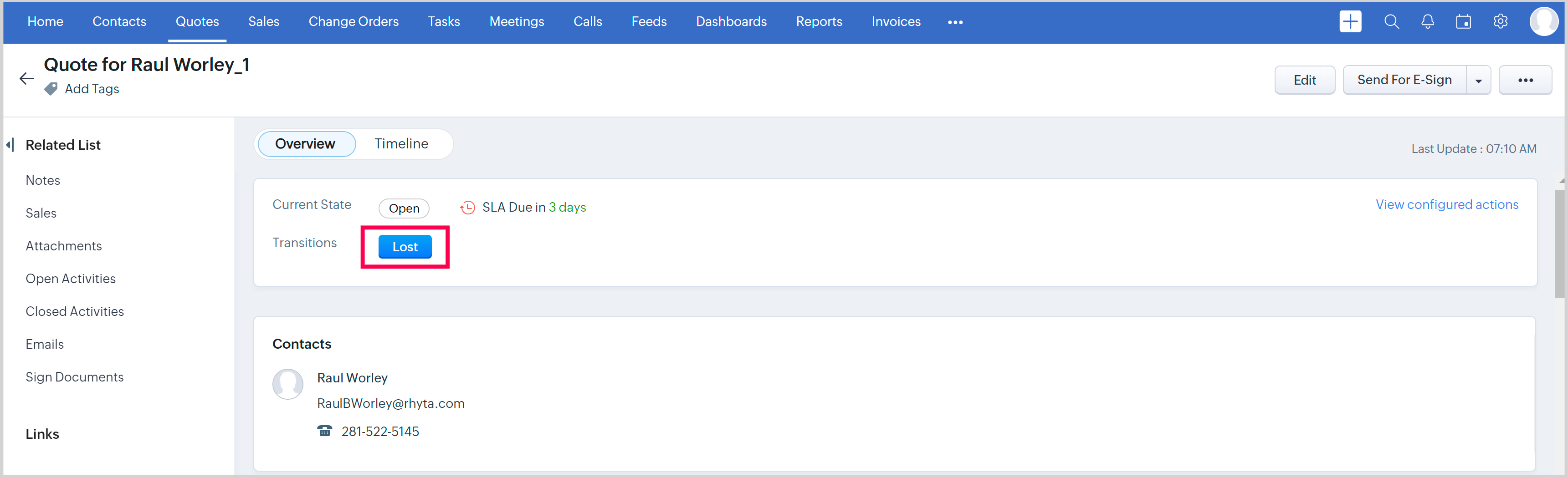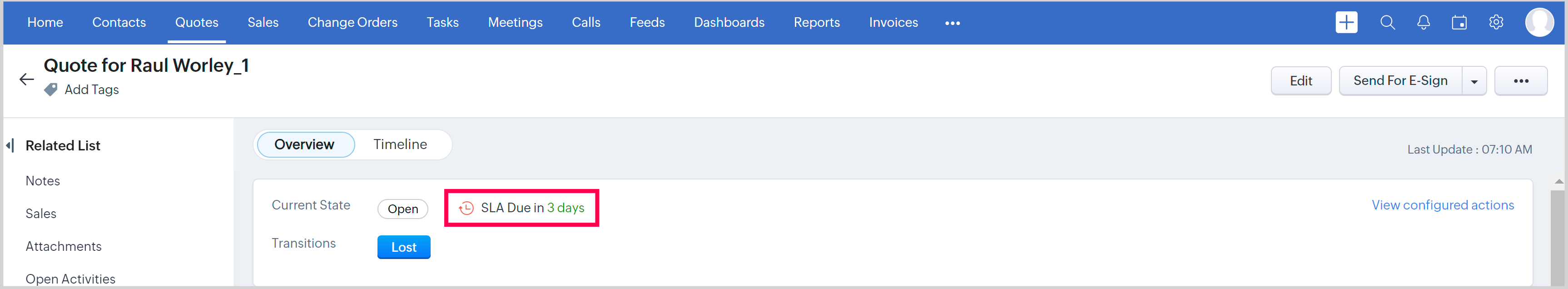 You can see how many days remain before the Quote automatically moves to Lost by reviewing "SLA Due in # days," which is located to the right of the Current State field at the top of the Quote record.