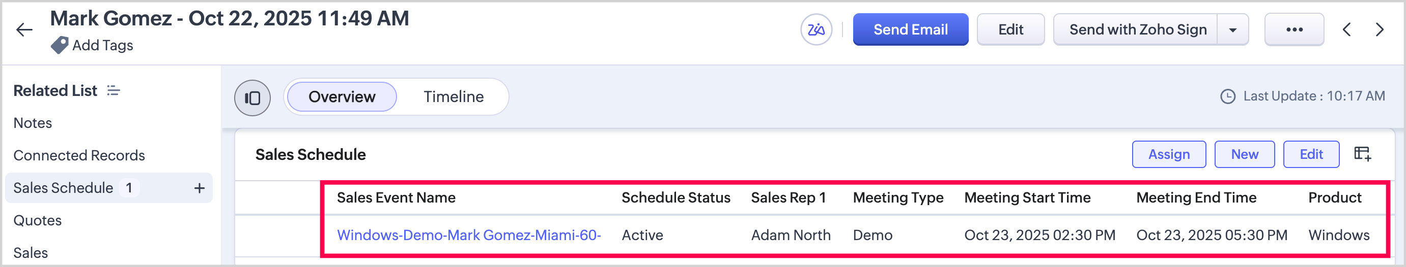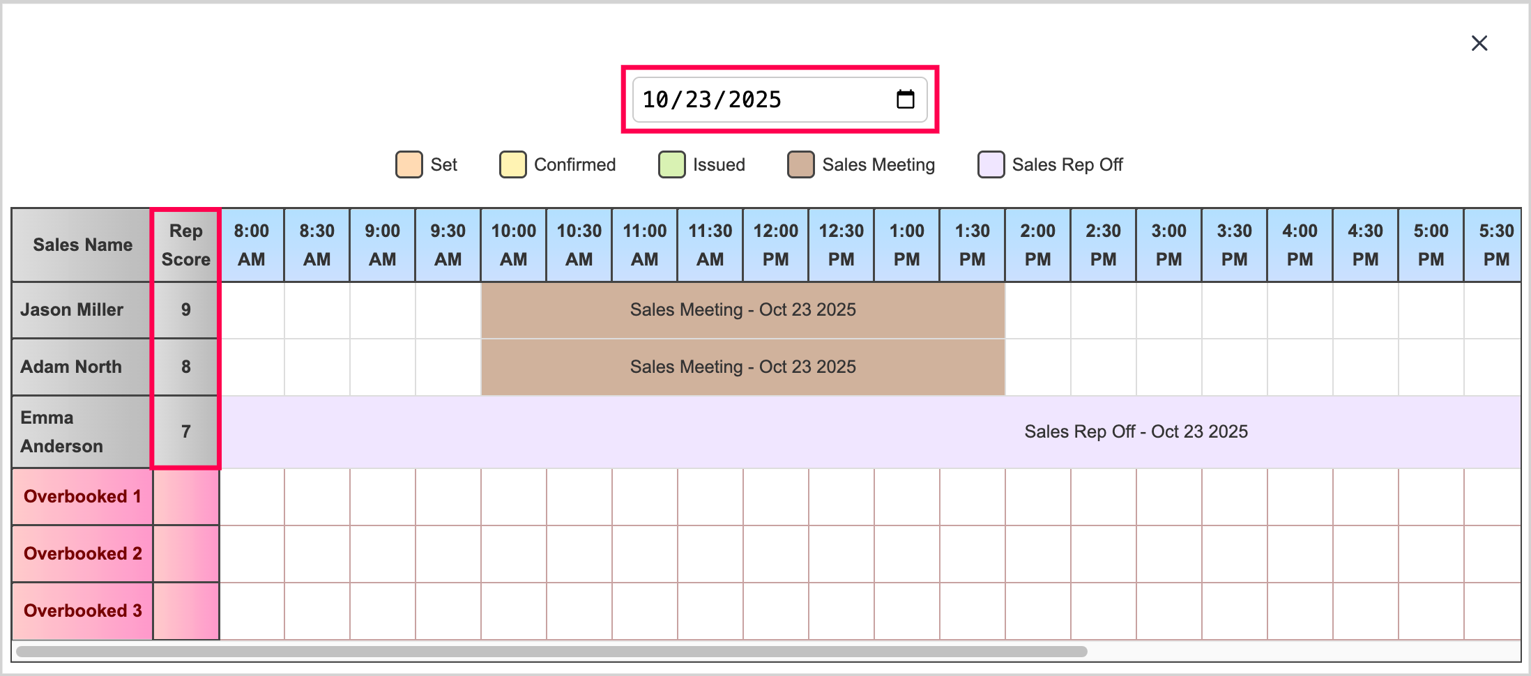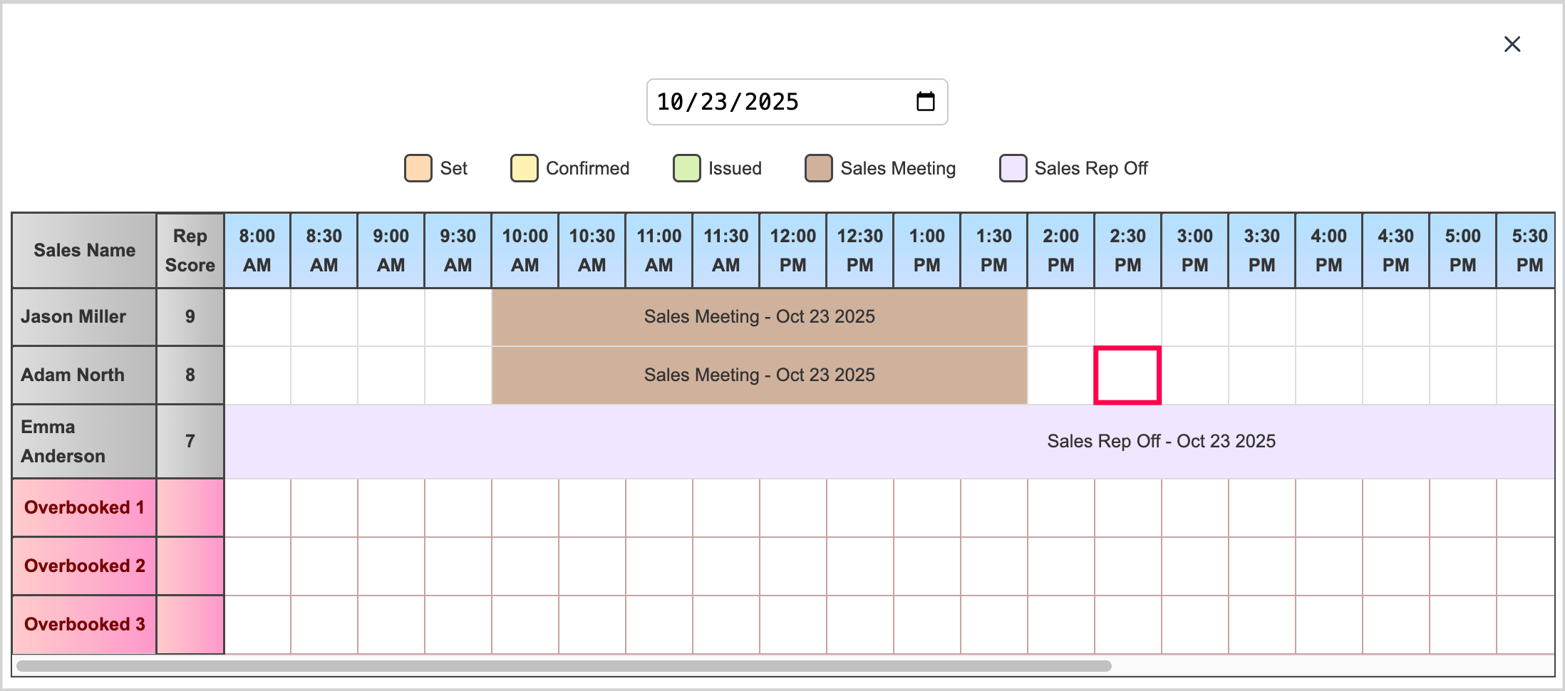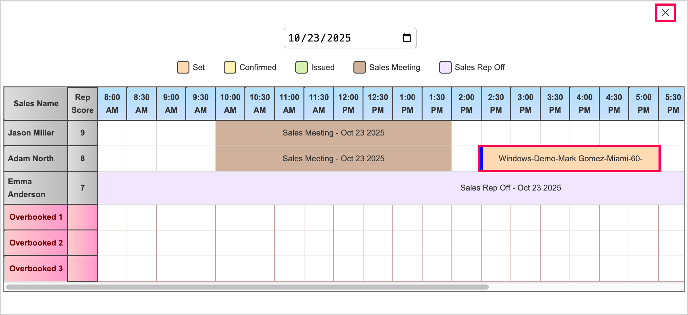Note: If there are no open time slots for a specific Sales Rep, you can use one of the available Overbooking rows. The Demo can be reassigned to an actual Sales Rep later.