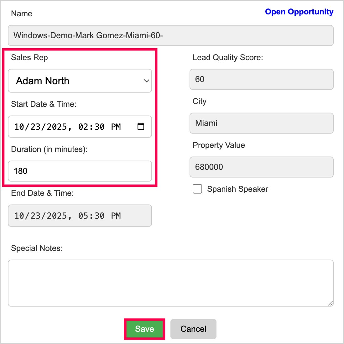 4. This will open a window that combines the selected Sales Rep and Demo Start Time with details from the Opportunity. The Demo Name follows this format: Product – Meeting Type – Contact Name – City – Lead Score – Job Size. Review the details to ensure the Sales Rep, Start Date & Time are correct, make any necessary adjustments to the Duration, and then click Save.