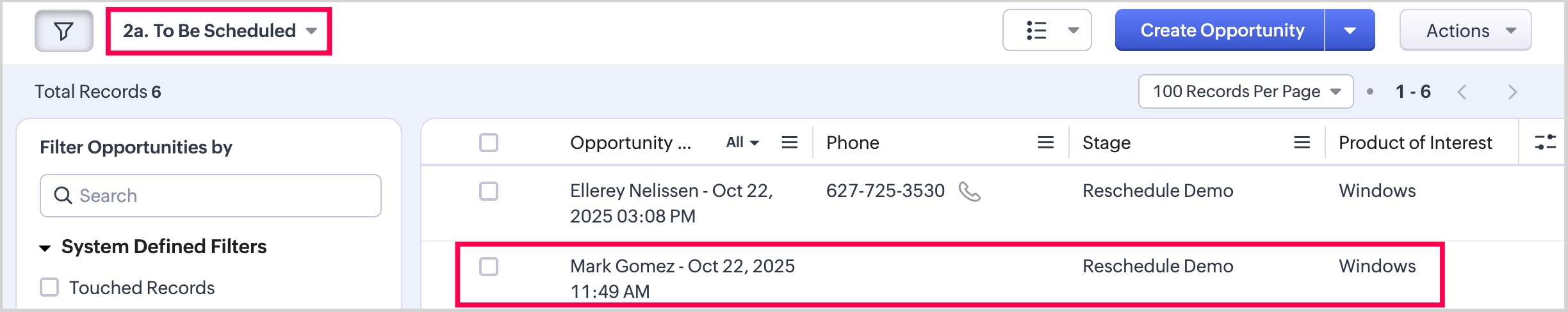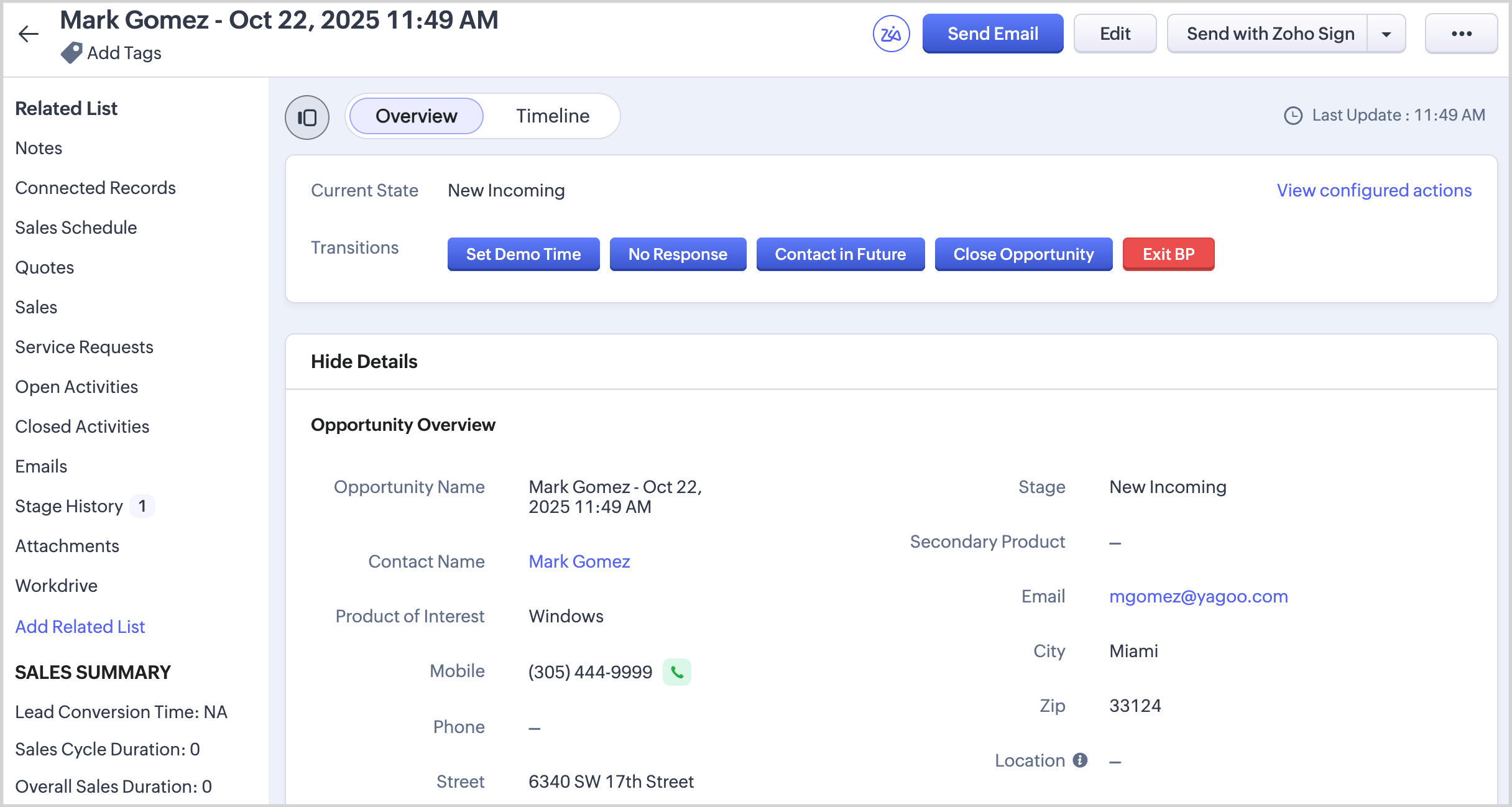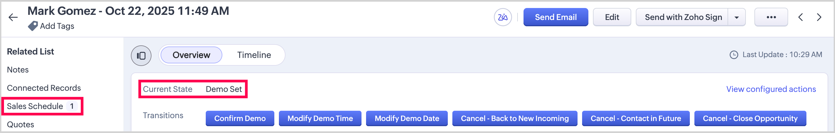 6. Returning to the Opportunity, you will notice that the Current State has moved from New Incoming to Demo Set, and the Opportunity now has a Sales Schedule record associated with it.