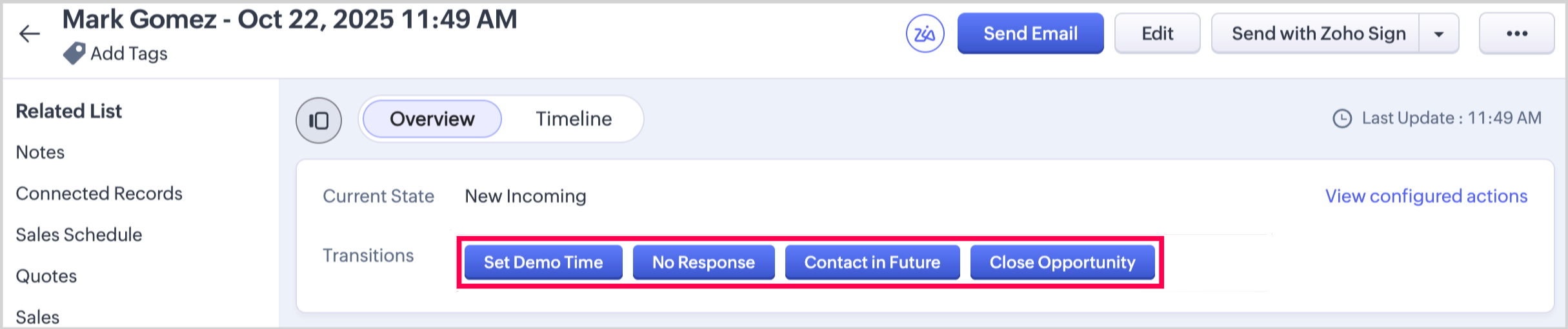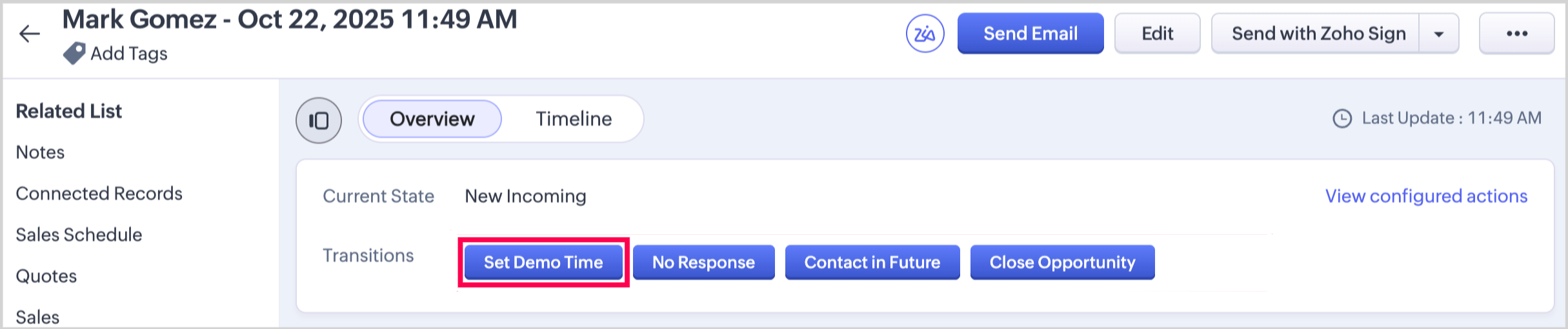 Note: After a Sales Rep meets with a Contact, if a Follow-Up meeting is needed, follow the same procedure outlined below, but start by clicking the Set Follow-Up Time transition (not pictured below).