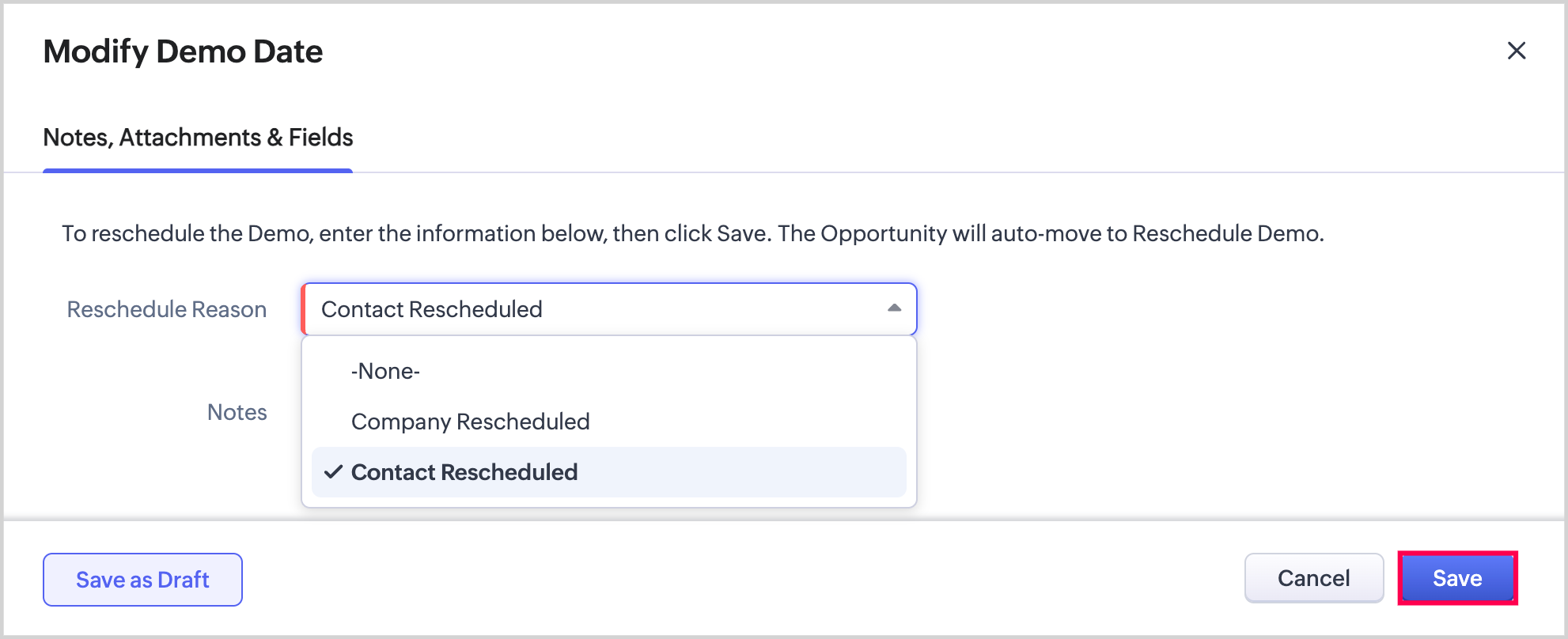 - Cancel - Contact in Future: Cancel the Demo and set a time to reach out to the Contact in the future.