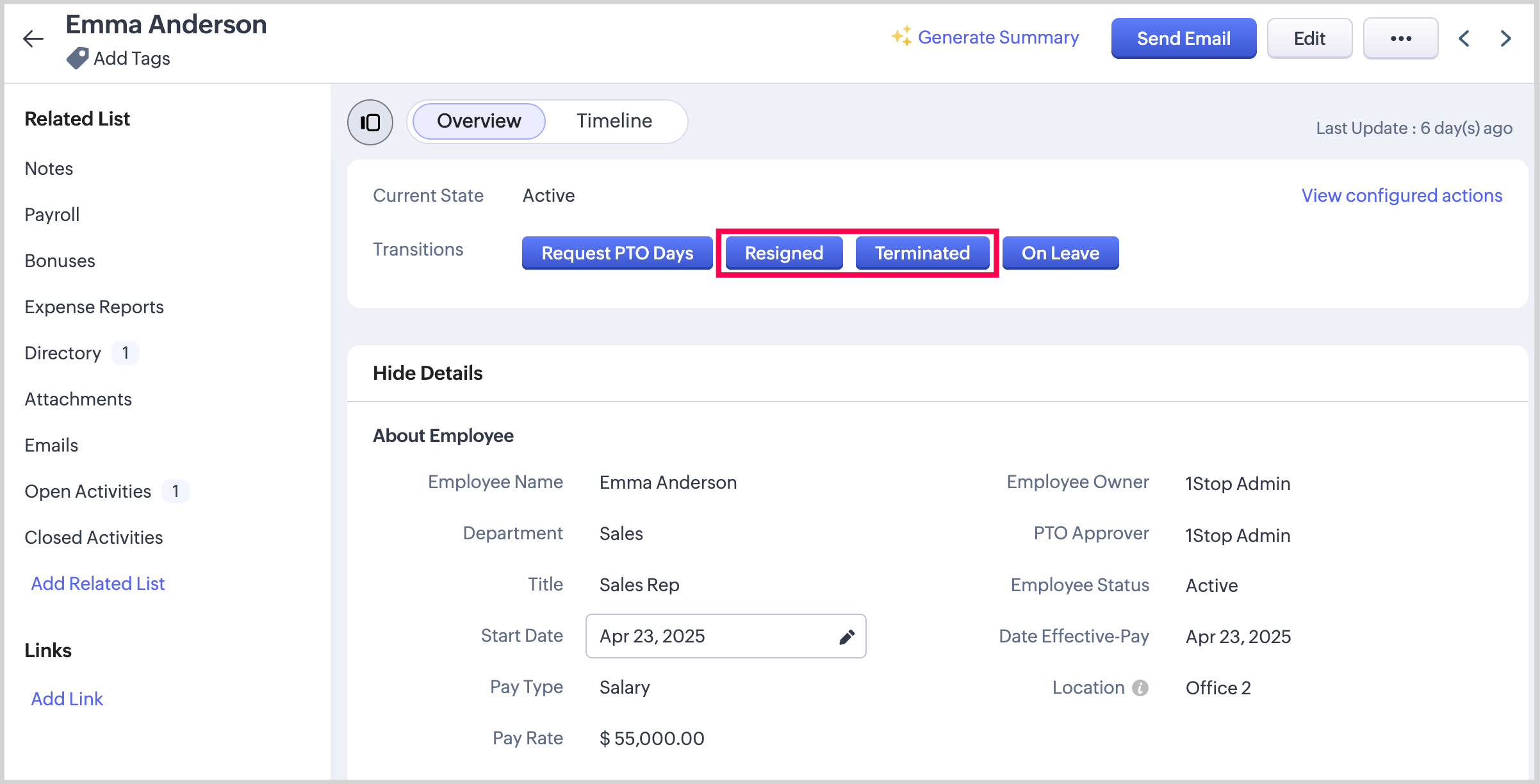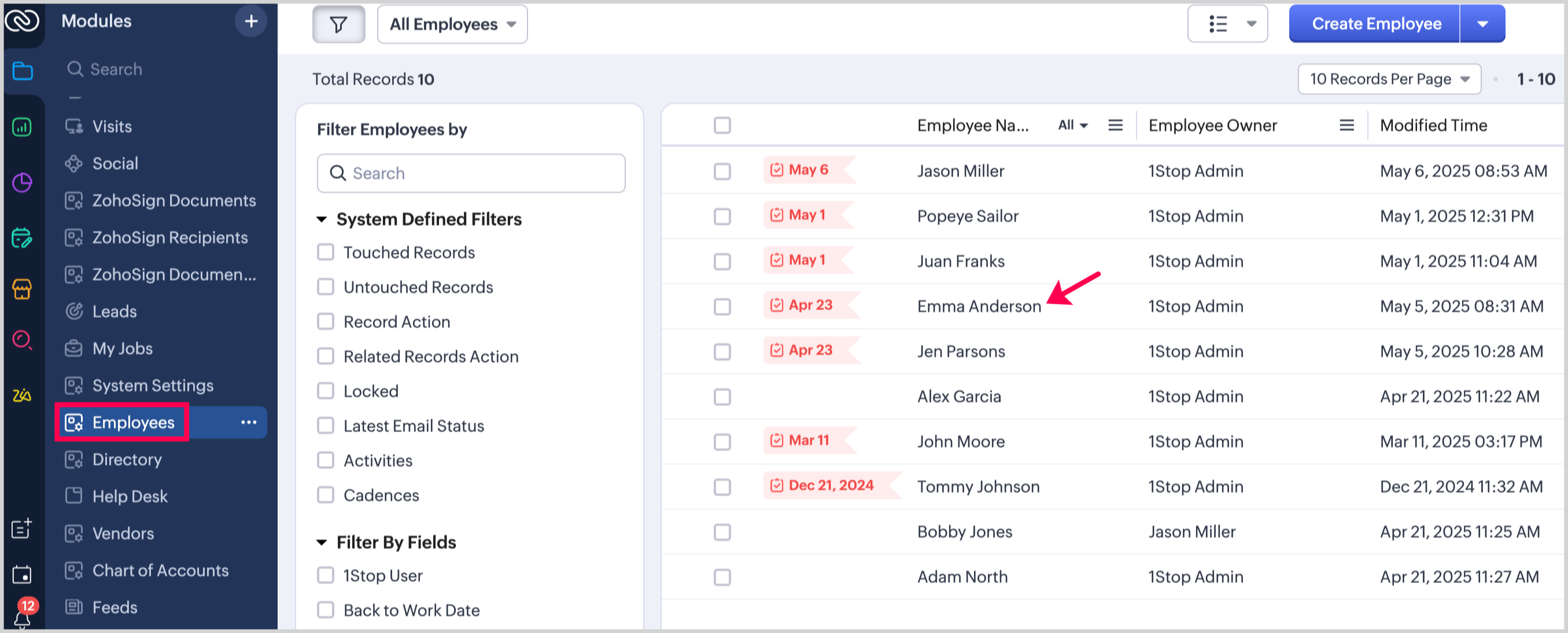 1. Navigate to the Employees module and click on the employee whose record you need to update.