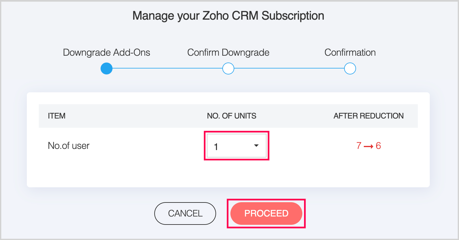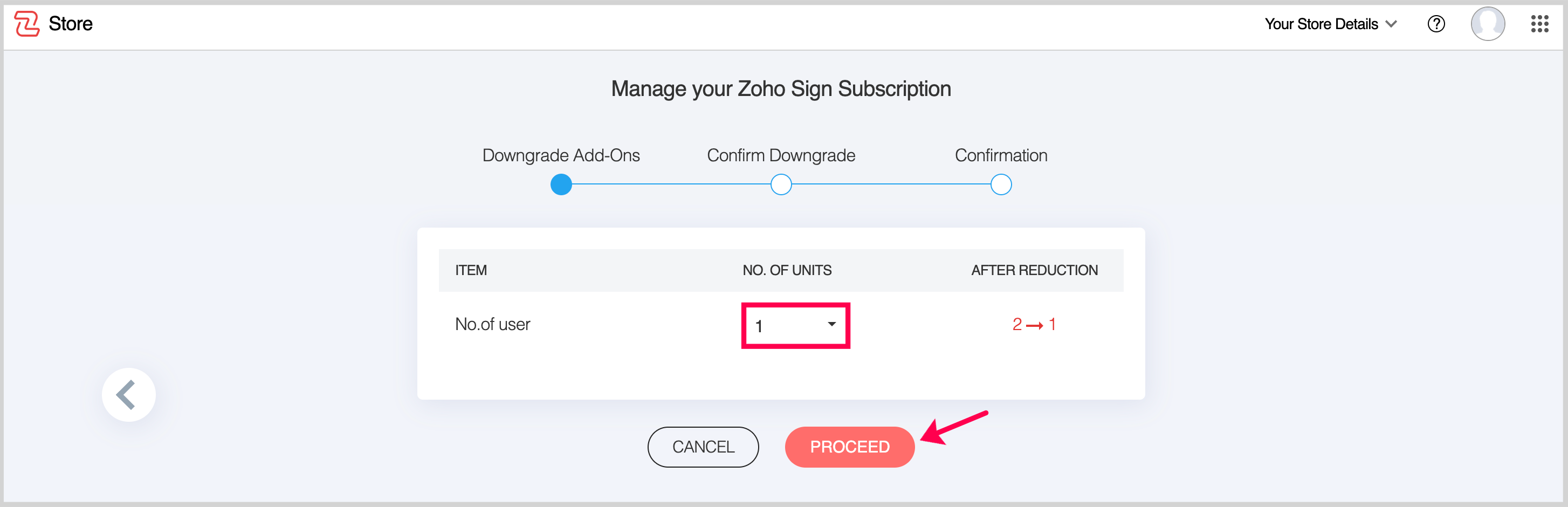 3. Enter the number of users you'd like to remove from your subscription, then click Proceed.