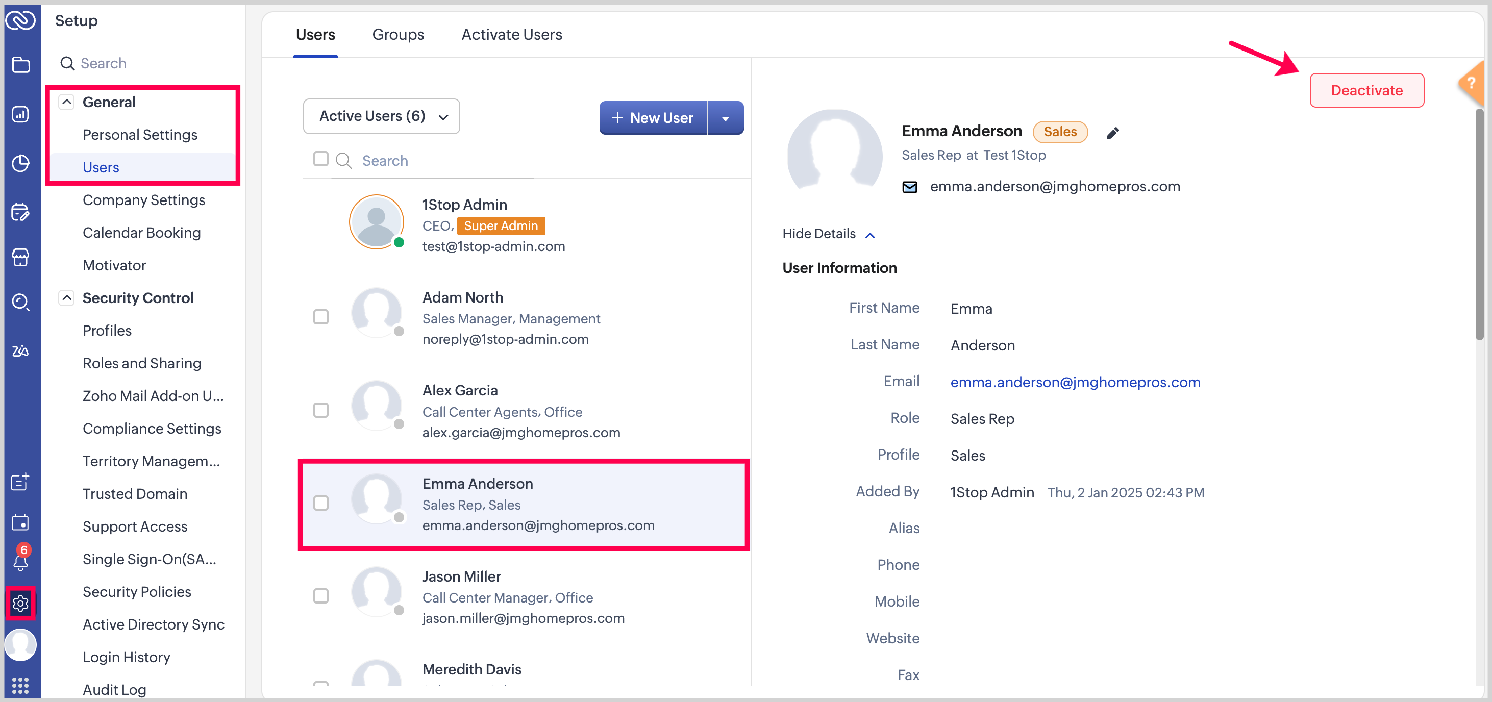 1. Log into 1Stop. Go to Setup > General > Users, click the name of the user you want to deactivate, then click the Deactivate button in the top-right corner.